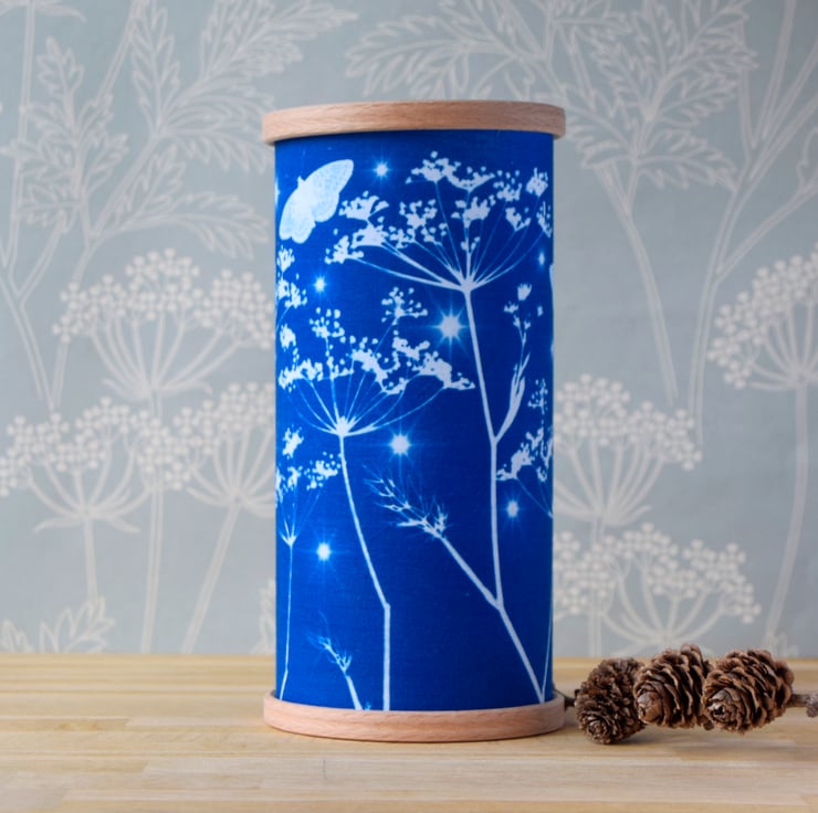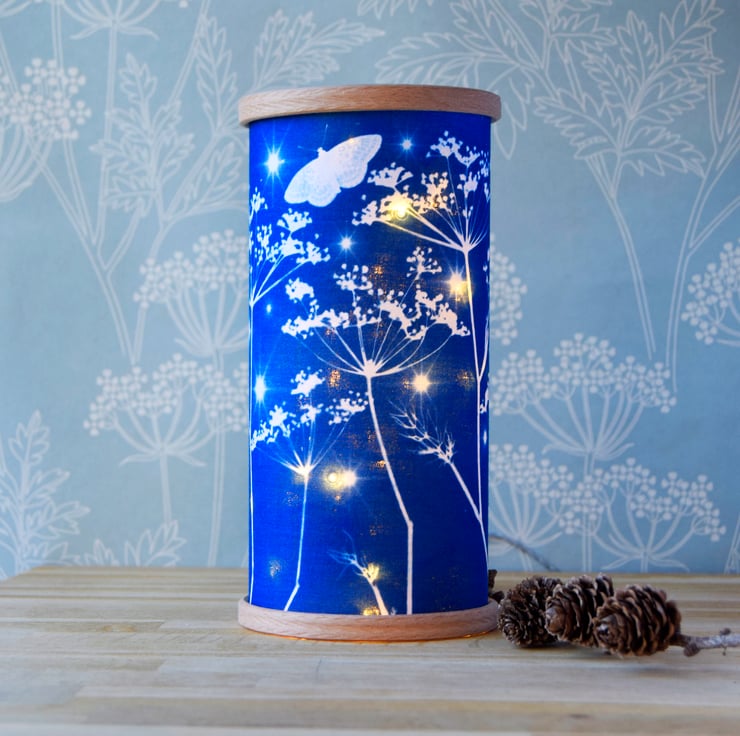 A gorgeous moth, fennel & stars material Cyanotype on a clear lampshade backing, finished with wooden hoops. A magical lantern supplied with your choice of either a flameless flickering tea light or battery powered fairy lights (batteries not included - 2 x AA needed.)