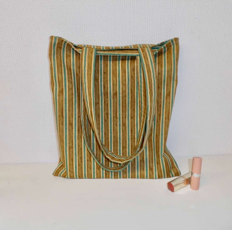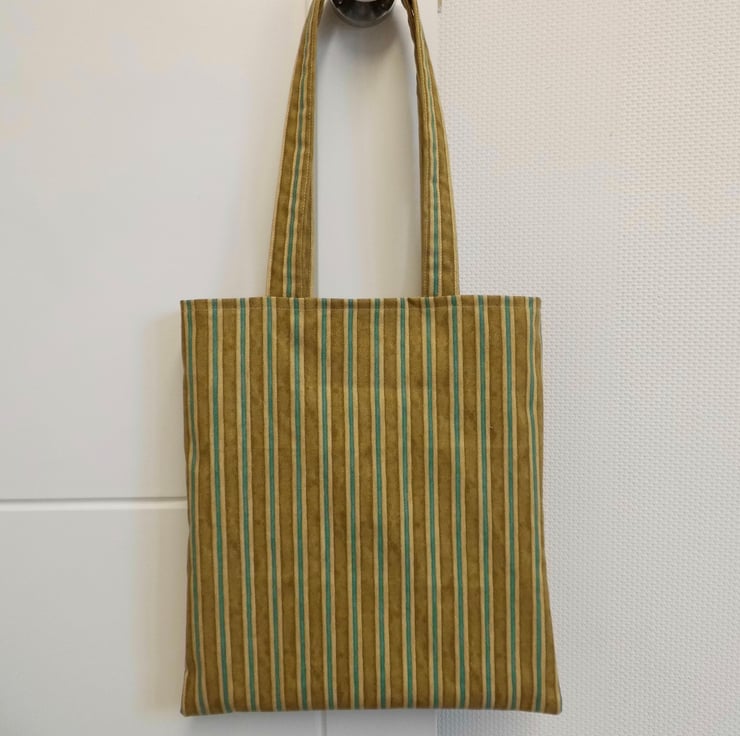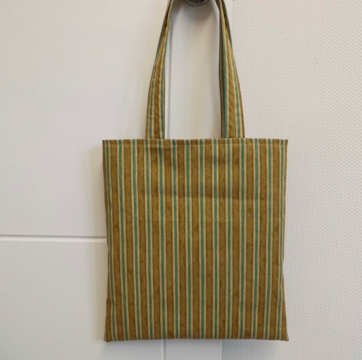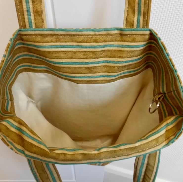A basic tote bag made using strong cotton fabric in mustard and turquoise stripes. It is faced at the top with the same fabric and then lined with beige cotton lining fabric. I have inserted a keyring into one of the inside seams, handy for clipping your keys or purse safely inside.