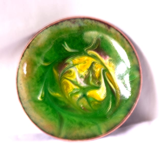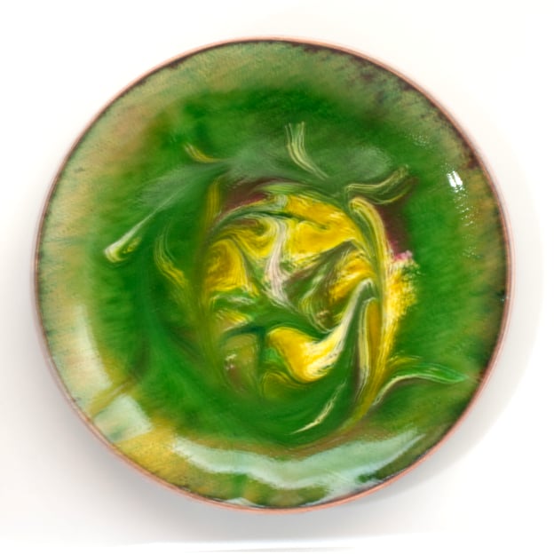 The pattern on this dish is a random, unrepeatable, pattern I made by drawing a steel point through the enamel while the dish was red hot, in the kiln. Because the green coat is laid over a base of clear enamel built up on the copper in some lights the copper may be seen, golden brown, through the green.