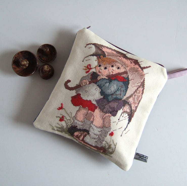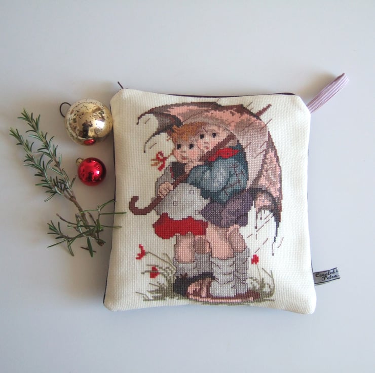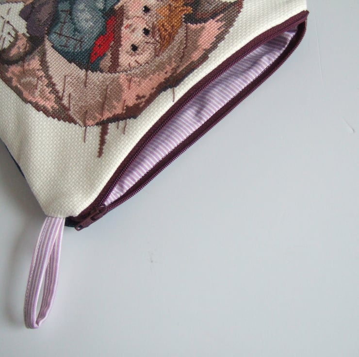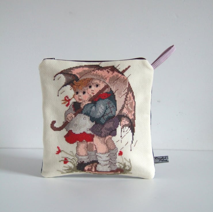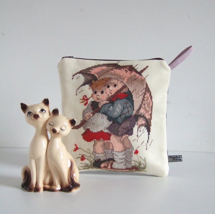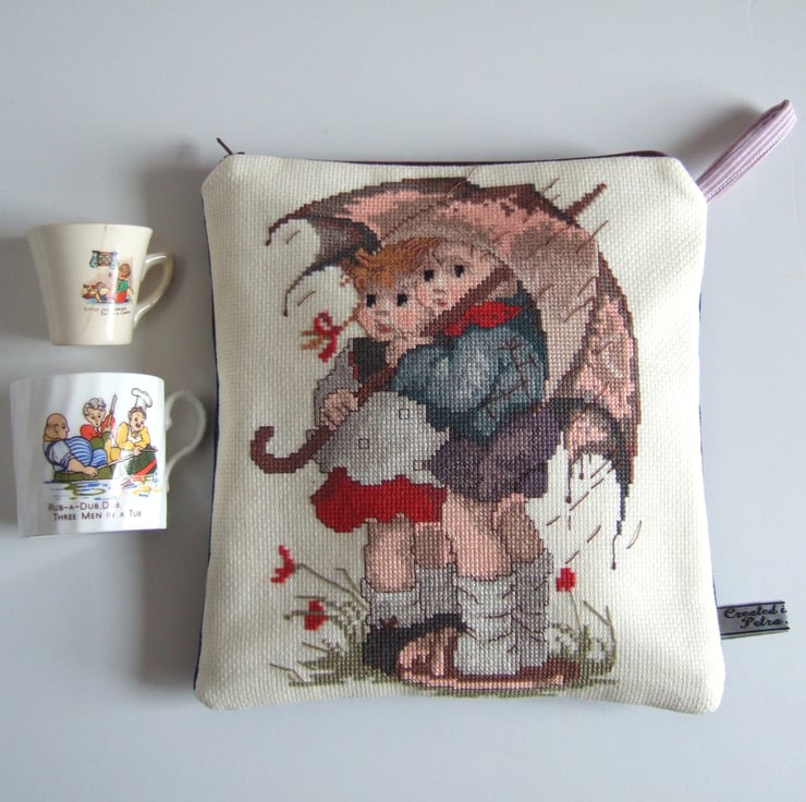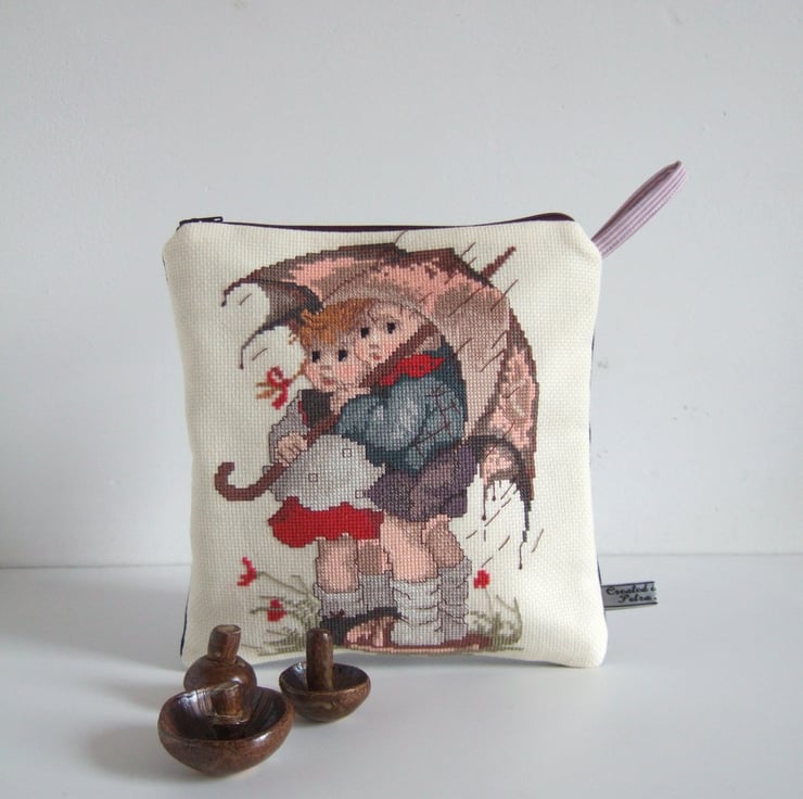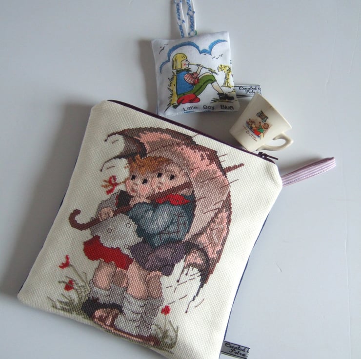 This little make up or storage bag, is made from a beautifully worked vintage cross stitch sampler. It features a sweet, but kitsch, design of two children sheltering from the wind and rain underneath a brolly, and looks very like the Hummel plates from the 1970’s. It may well be a sampler designed by them. This would make a great present for a lover of vintage fabrics, perhaps for someone learning to embroider, or maybe even as a congratulations gift for new parents of twins. (I have twins, and I would have liked this!)