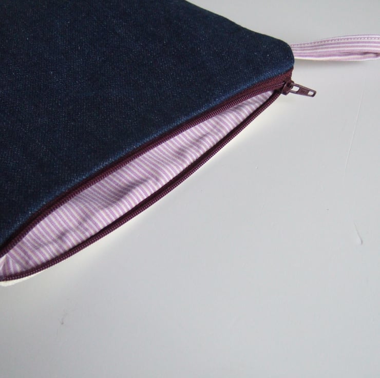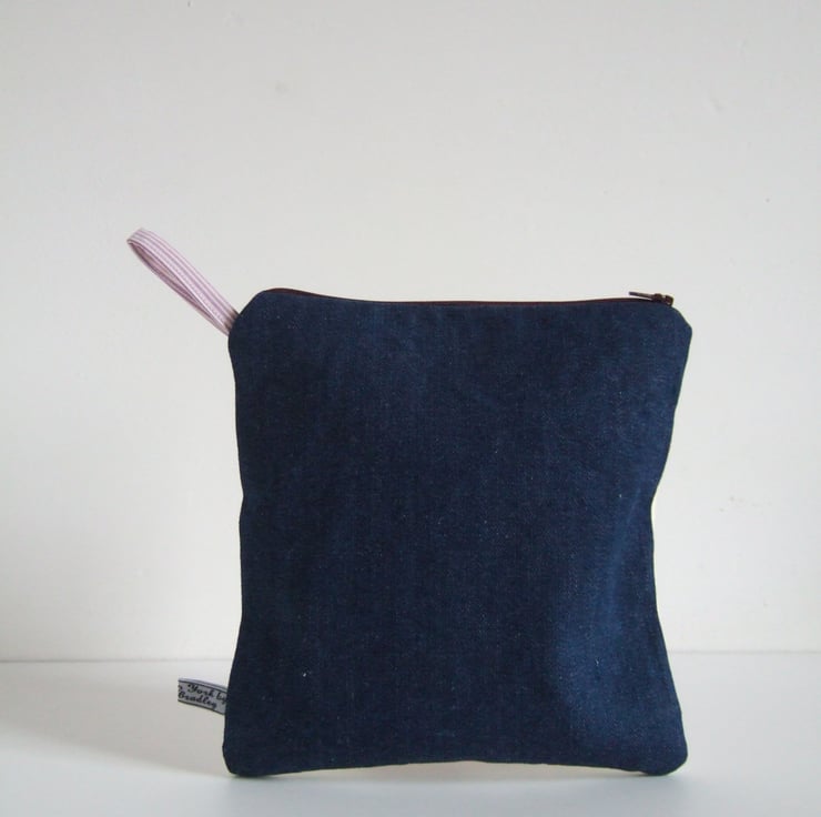 It measures 21 cm across and 23 cm down, and closes with a maroon 21 cm zip. The back is made from recycled blue denim to give it some edge.