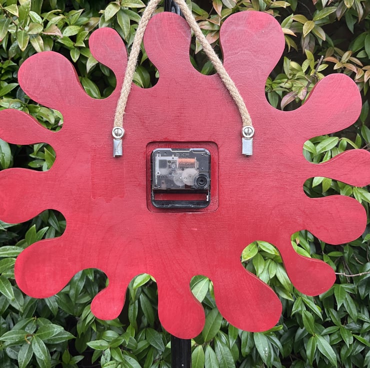 A wall hung 'Splat Clock' coloured cardinal red with contrasting black arabic numerals and matching black metal hands. The clock is designed to be wall hung on a thick suspension cord. The clock is powered by a Seiko quartz mechansm with a quiet ticking second hand. Splat dimensions approximately 350mm x 300mm x 12mm thick.