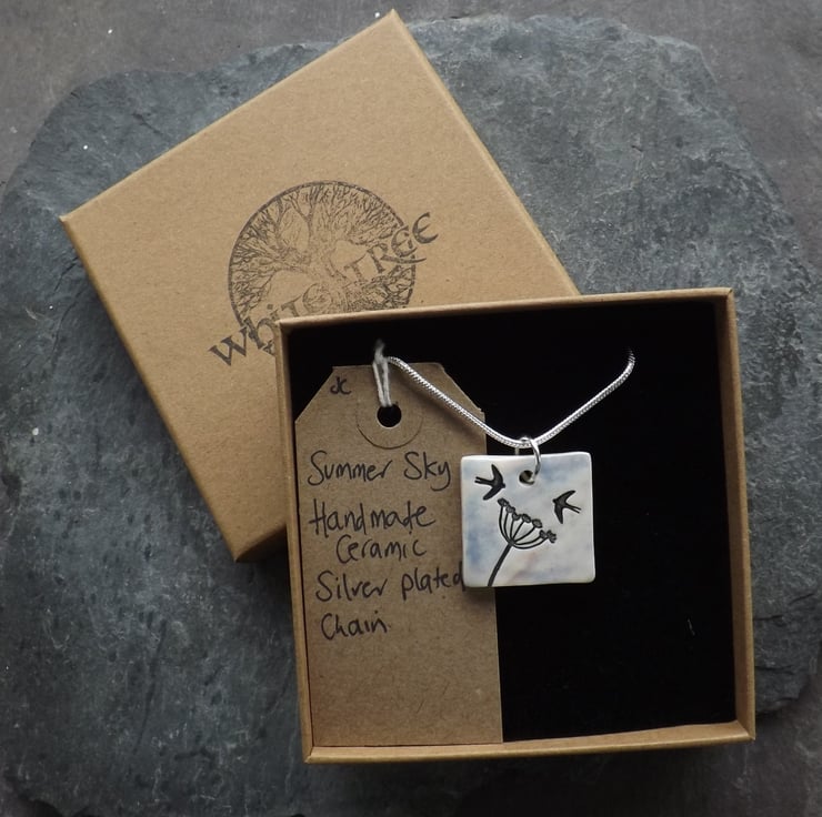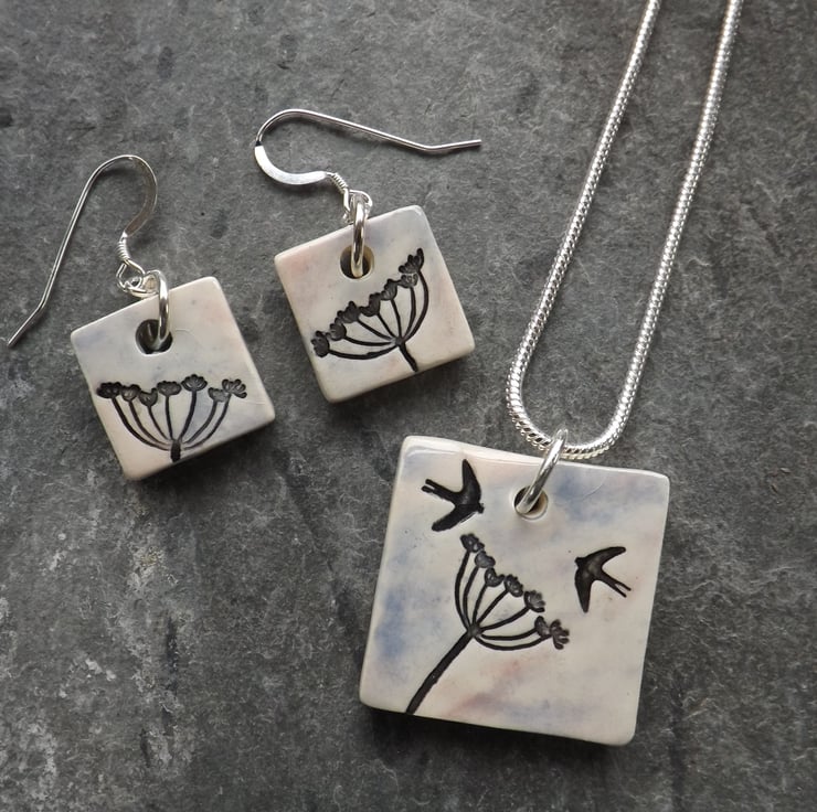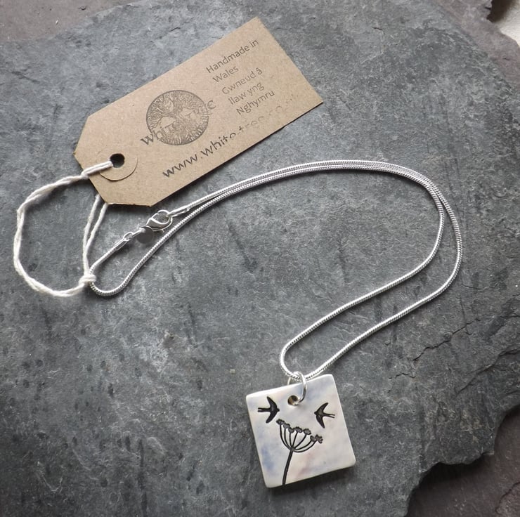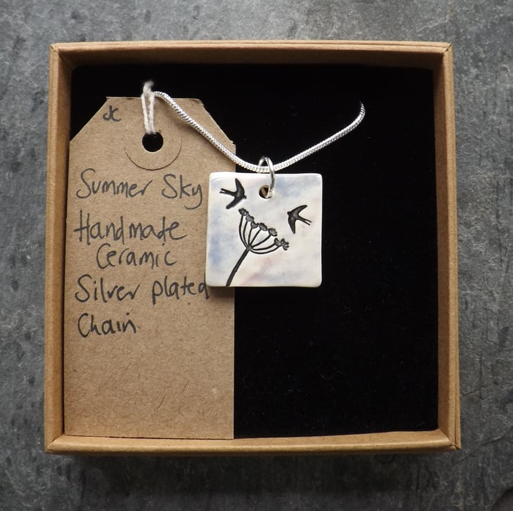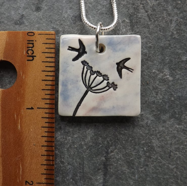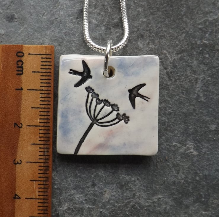 This pendant has a design of cow parsley and swallows stamped into the wet clay, and a background of soft blue and pink. As with all my jewellery it is made and decorated entirely by hand.