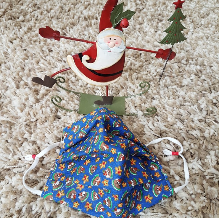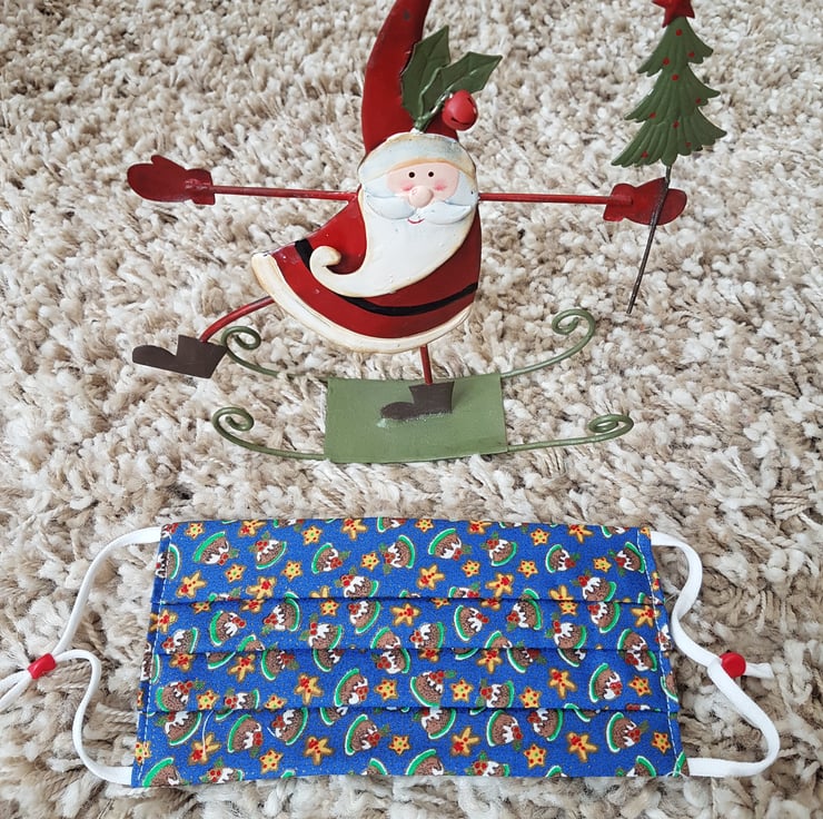 Adult festive face covering made from a Christmas pudding print. The face mask is made with 2 layers of cotton forming an inner pocket for a filter (not included) and is fastened over the ears with 2 loops of elastic and a toggle adjuster.