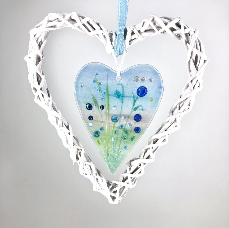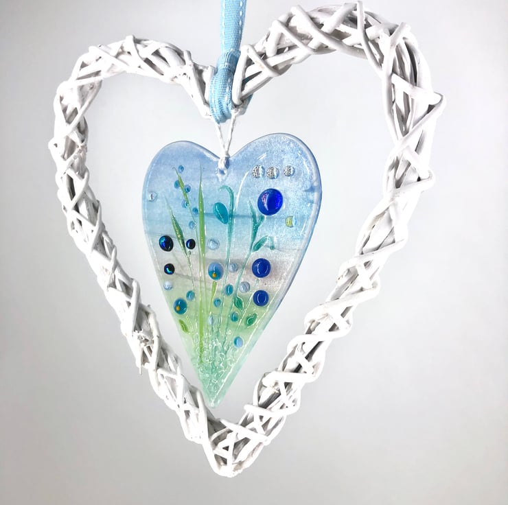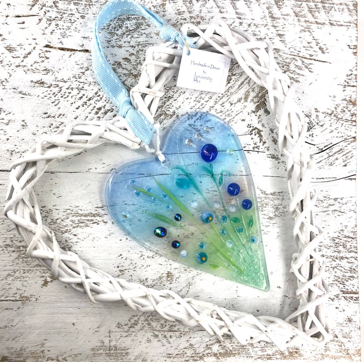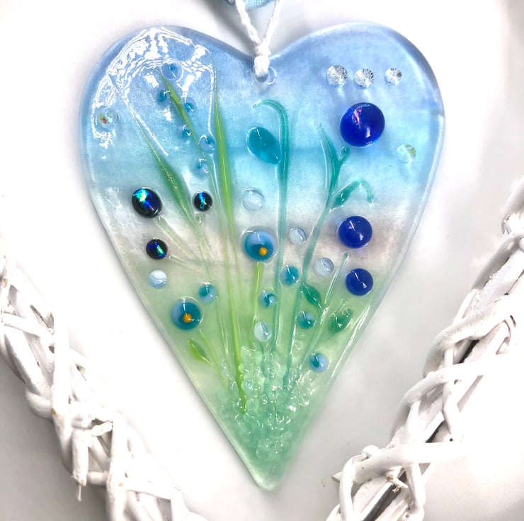 A pretty glass heart with a delicate mix of blue & turquoise meadow flowers. This dainty piece has tiny flowers and foliage, some of which has been created using a lamp work torch with sparkly dichroic glass running throughout.
