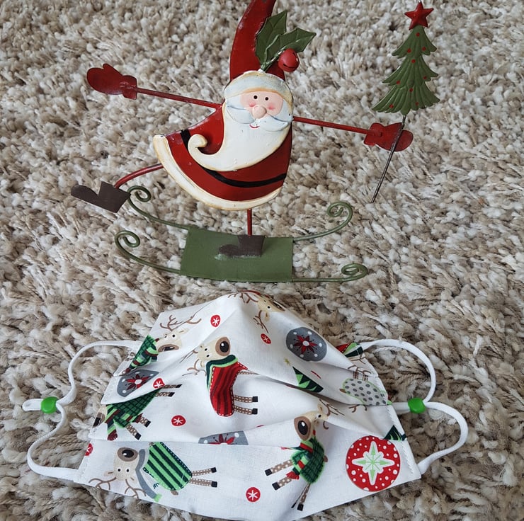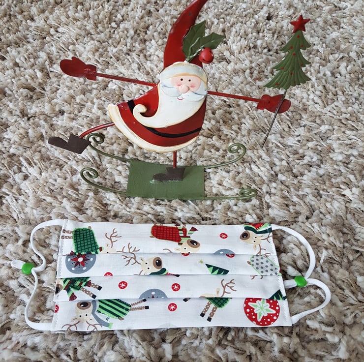 Adult festive face covering made from a reindeers in coats print. The face mask is made with 2 layers of cotton forming an inner pocket for a filter (not included) and is fastened over the ears with 2 loops of elastic and a toggle adjuster.
