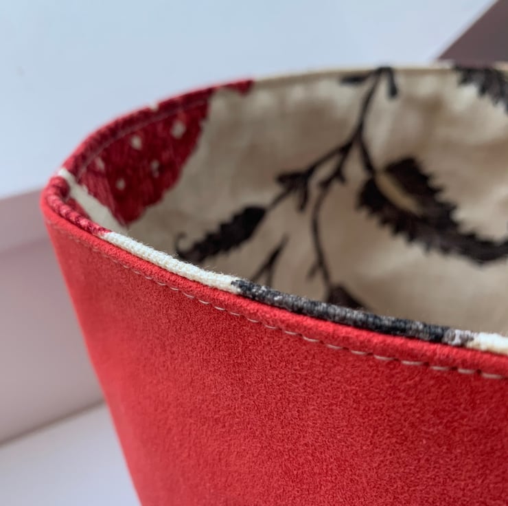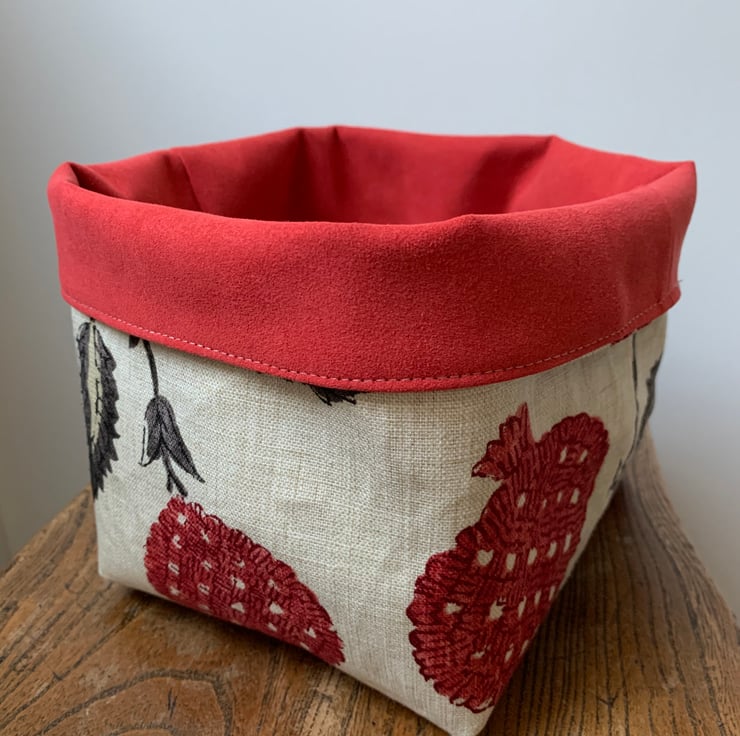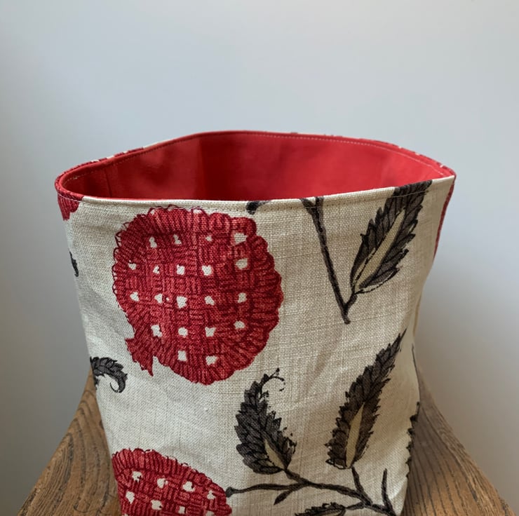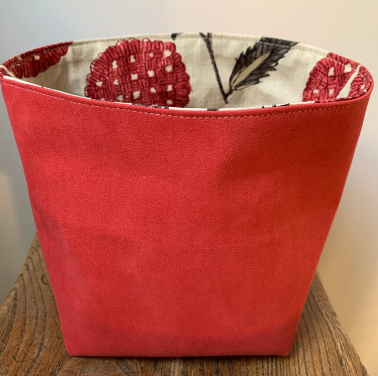 Reversible fabric basket made from soft red faux suede and Sanderson Anaar cotton/linen-mix fabric. Can be used with a turn-down to make the most of the contrasting fabrics.