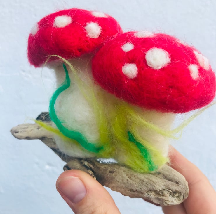 This needle felted toadstool comes with an individual and unique driftwood stand, each one different and special.