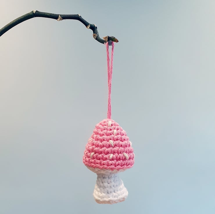 A cute little crochet toadstool bauble, made up in pink cotton yarn. Perfect for any woodland or Scandi style decor this Christmas - or, simply because crochet mushrooms are adorable!