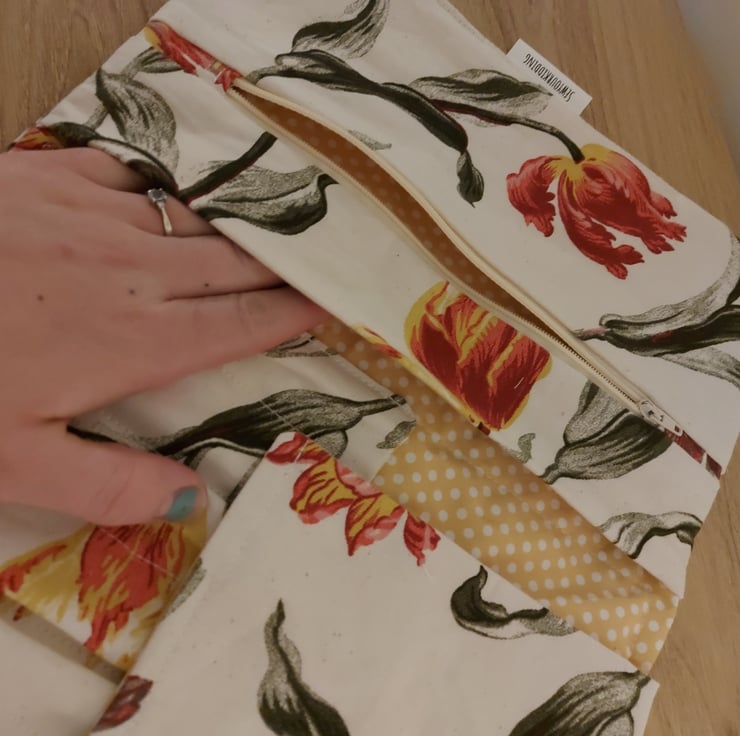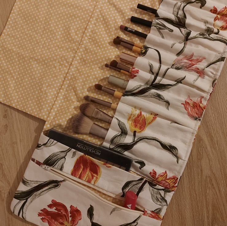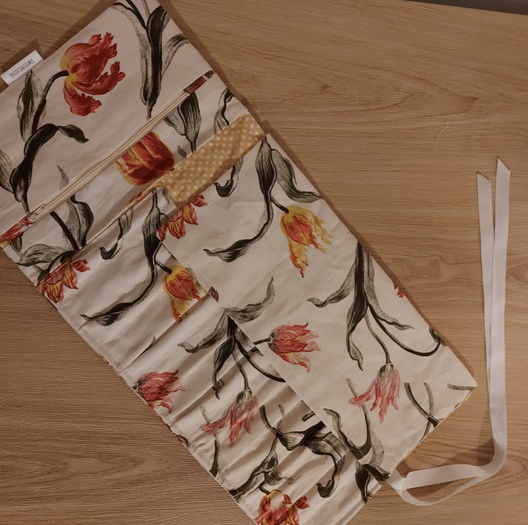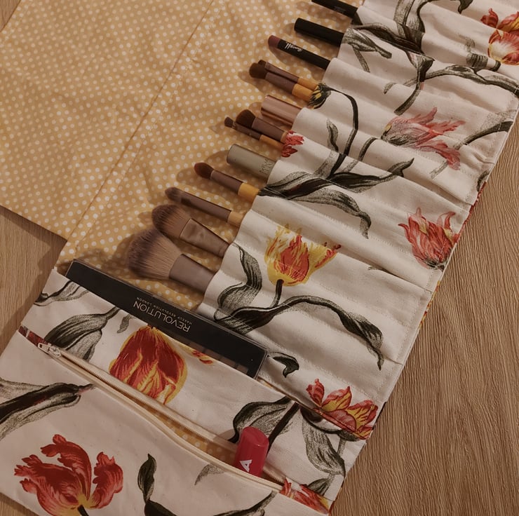 This is a tulip print make up bag and brush role . When you untie the ribbons it unroles there is a flap you lift up to stop your brushes from getting tangled and then lots of diffrent sized pockets for brushes and you maskara and eyeliners there is a large zipped pocket to use as a make up bag for the smaller items and a pocket undreneath that to use for a pallet