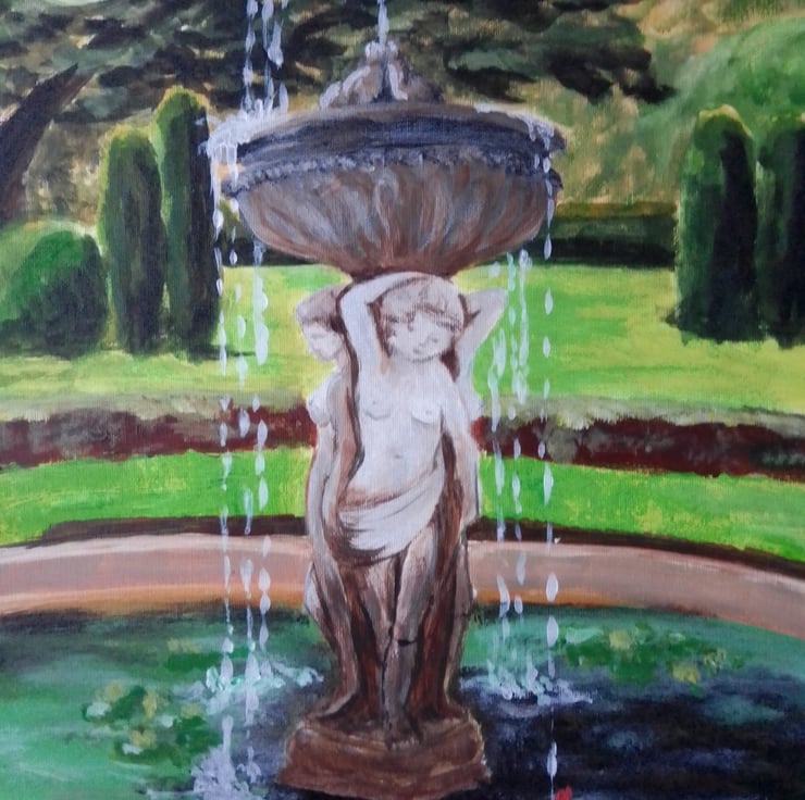 An original acrylic painting on quality paper of a lovely garden. In a pond a statue stands of ,nearly, nude women. It is a fountain. Such an atmospheric and calming scene.