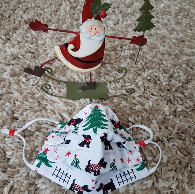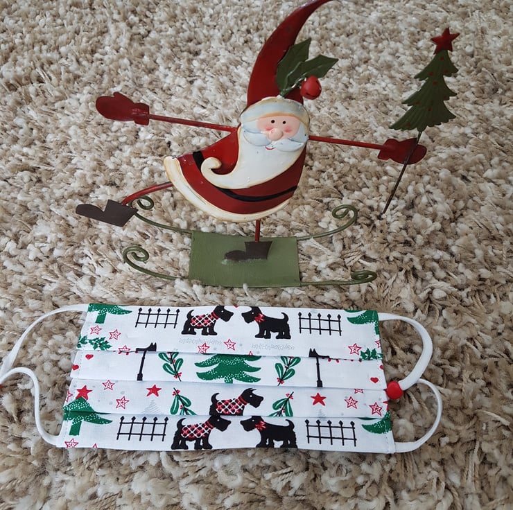 Adult festive face covering made from a festive doggies print. The face mask is made with 2 layers of cotton forming an inner pocket for a filter (not included) and is fastened over the ears with 2 loops of elastic and a toggle adjuster.