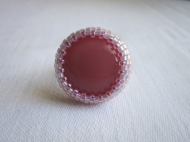 A lovely little pink beadwork ring measuring approximately 2.2cm in diameter made using a glass cabochon and Japanese seed beads. The ring base is silver plated and approximately 1.7cm inside diameter and is adjustable.