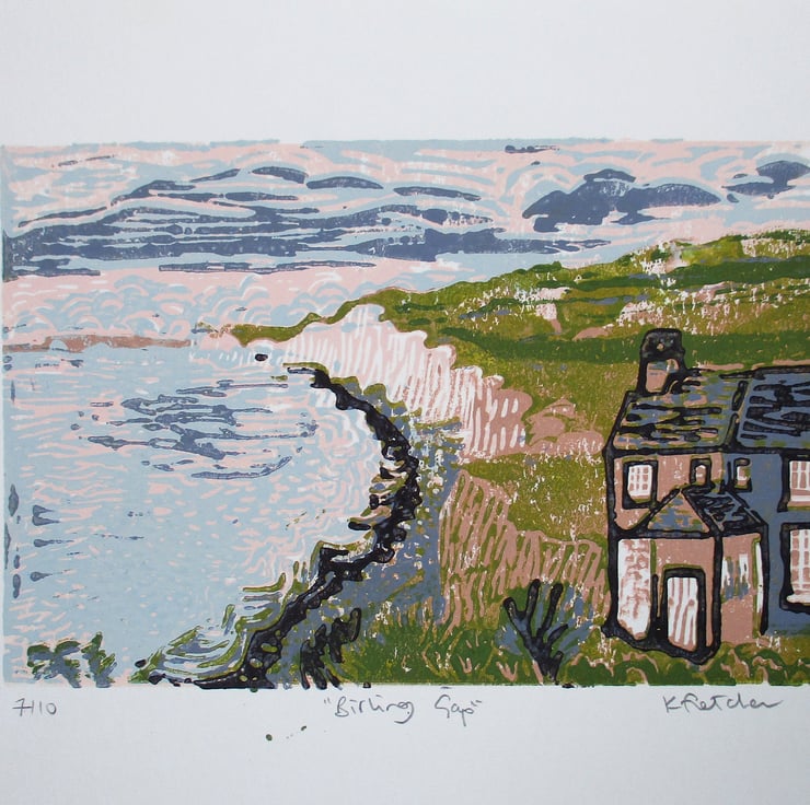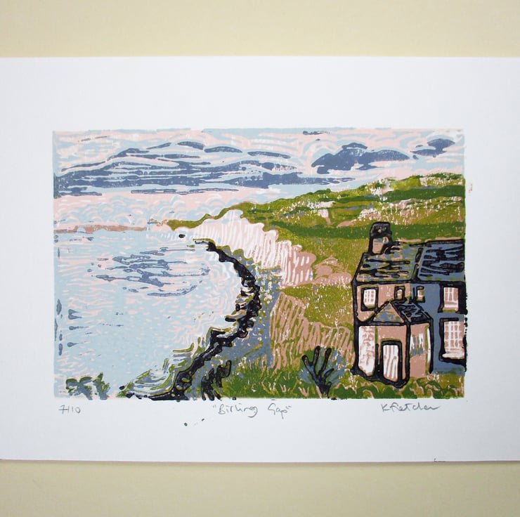 This is a hand pressed reduction linocut print of the National Trust protected stretch of coastland at Birling Gap near Eastbourne, East Sussex looking towards the Seven Sisters.