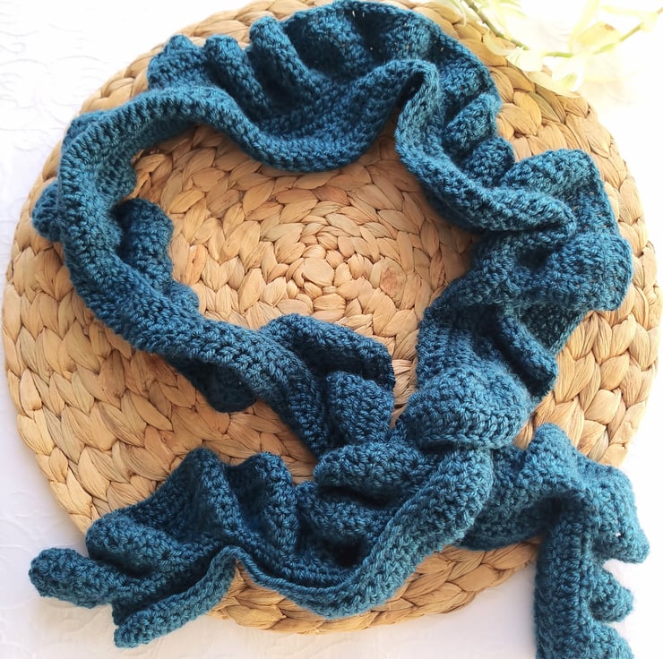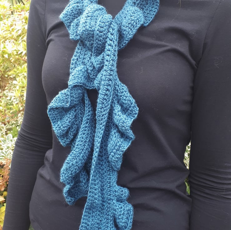 In a luxurious soft merino blend yarn this Teal scarf has a frilled edging and is perfect wearing with a coat or jacket or just to brighten up a top.