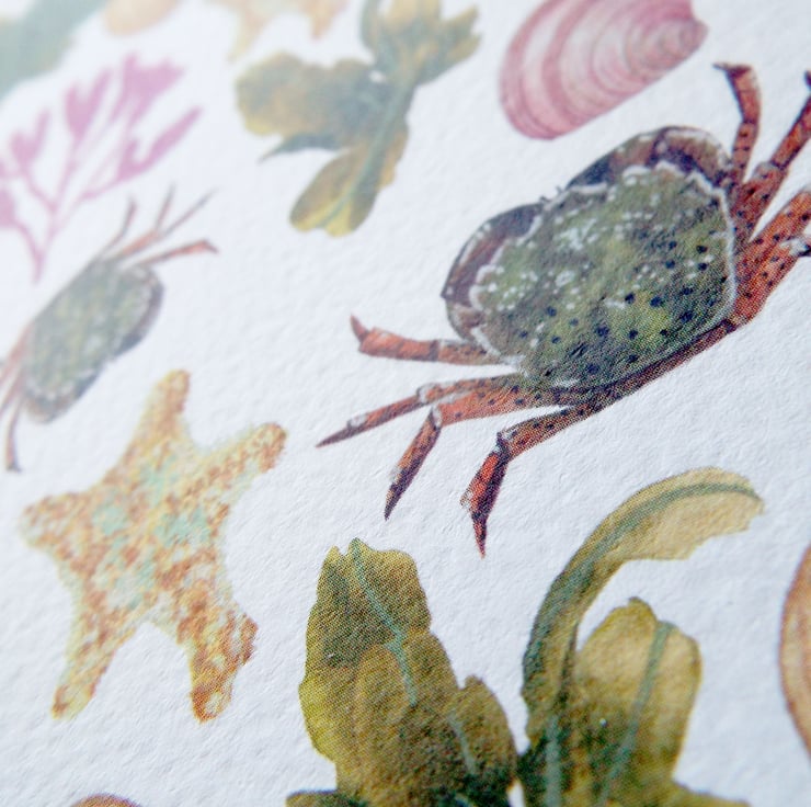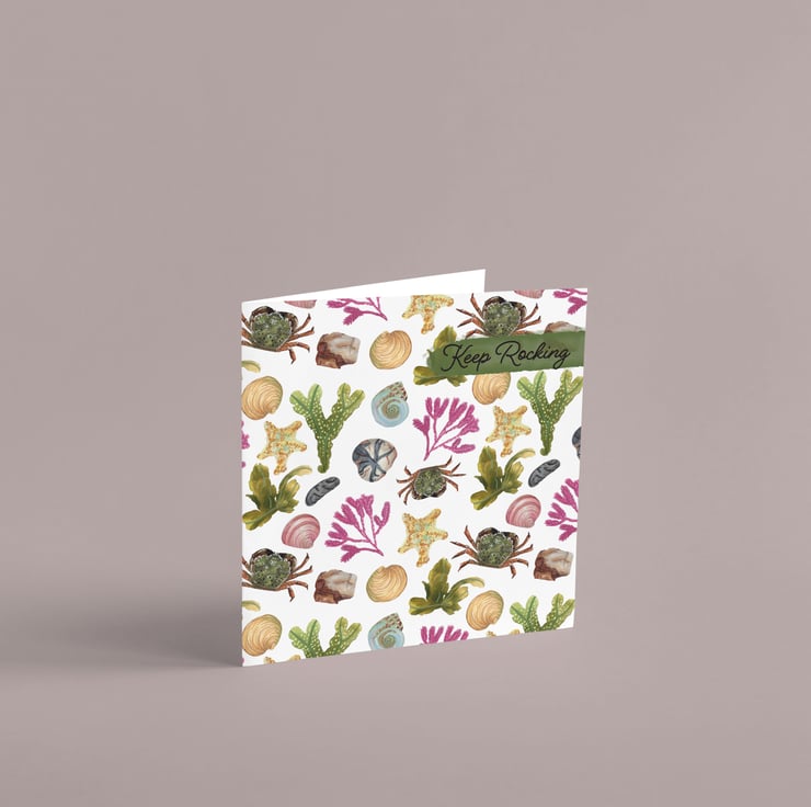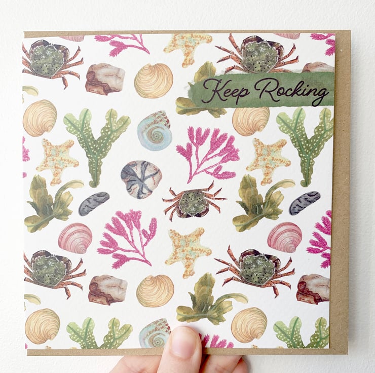 The card is a high quality printed on to 300 gsm Tintoretto gesso which gives a lovely watercolour paper texture and feel while keeping the colours bright and vibrant. The images on the card are all the things you may find while exploring the rock pools at the beach. Each one has been hand painted with Winsor and Newton watercolours and made into the lovely card for you to enjoy. The font place in the top corner of the card reads 'keep rocking' and is blank inside. It come withs its own Kraft envelope and has been placed into a clear composable envelope to protect it.