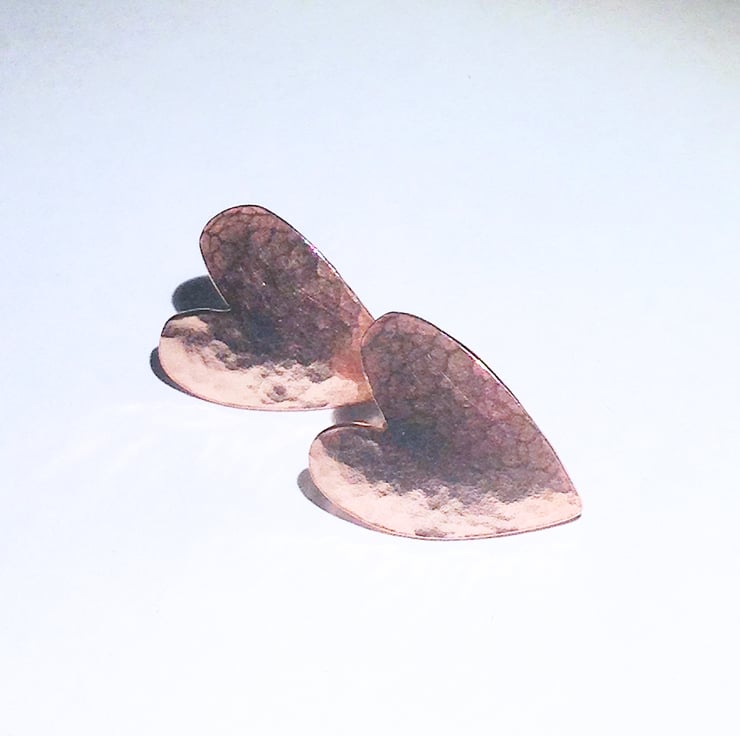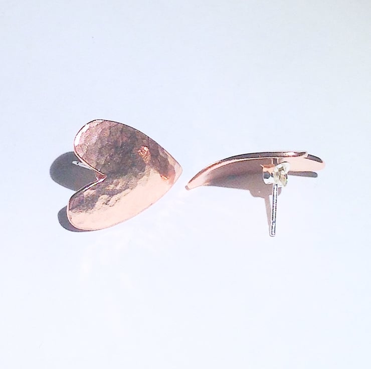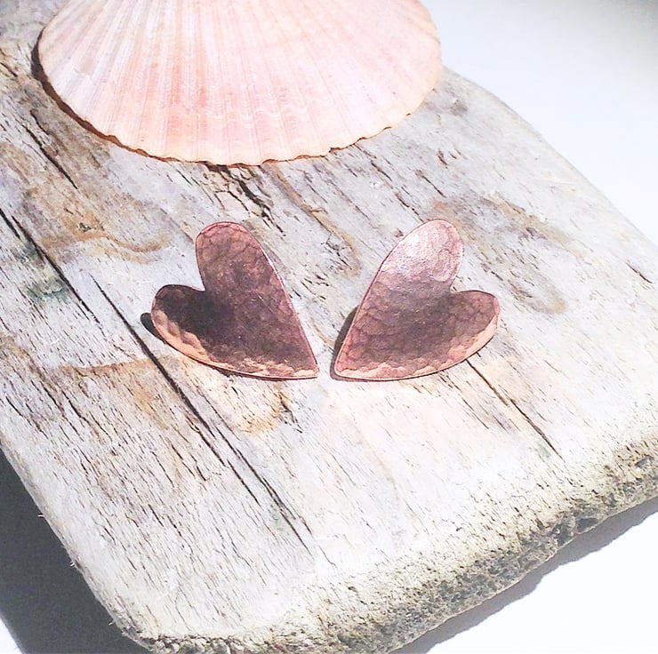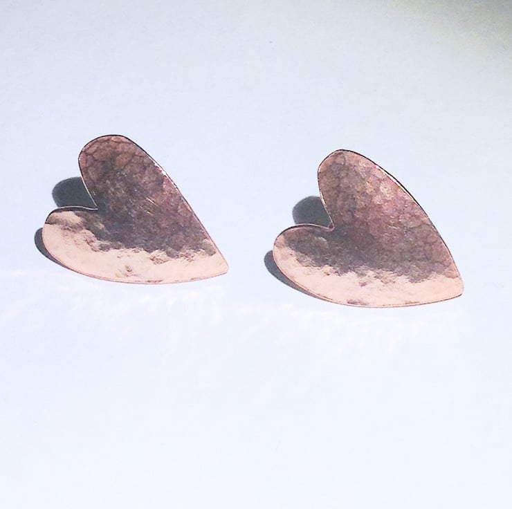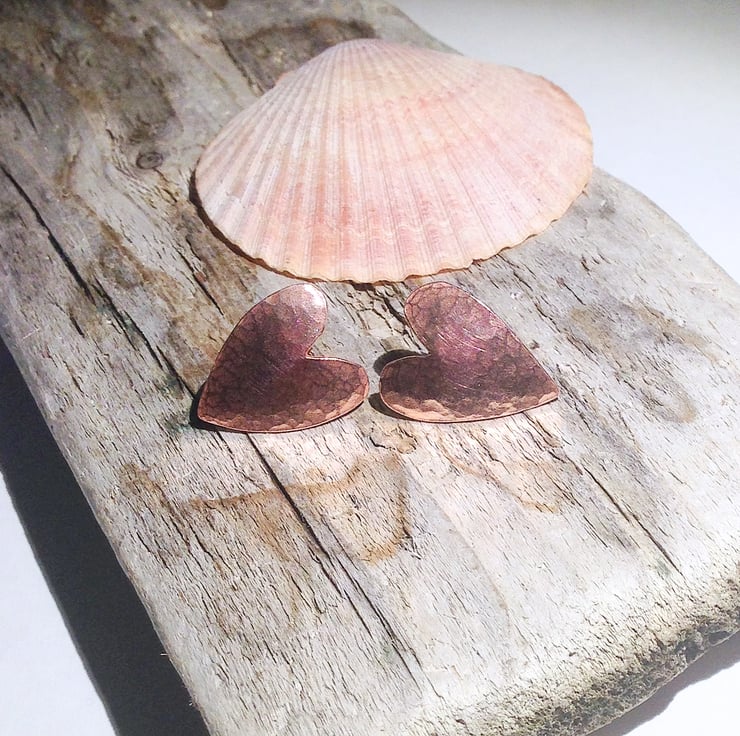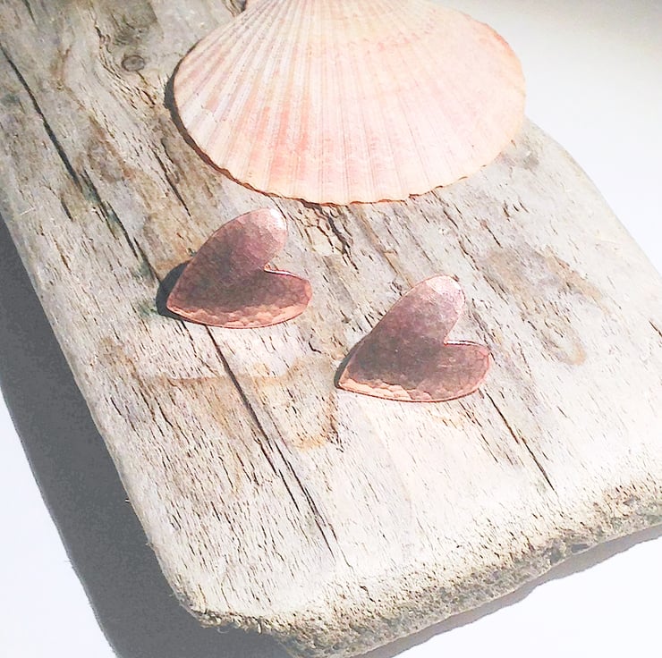 I have created these beautiful copper stud earrings by hand sawing hearts from sheet copper. I've given them a hammered finish, domed them to create shape and then soldered on sterling silver earring posts which have scroll back and then polishing them.