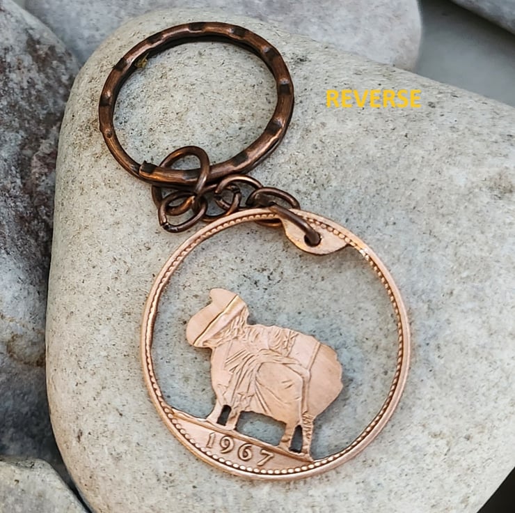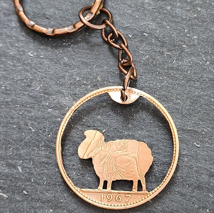 A sheep, cut out from a 1967 pre-decimal bronze penny coin with a fine-bladed jeweller's saw - this is NOT machine-cut with a laser! 3cms across.