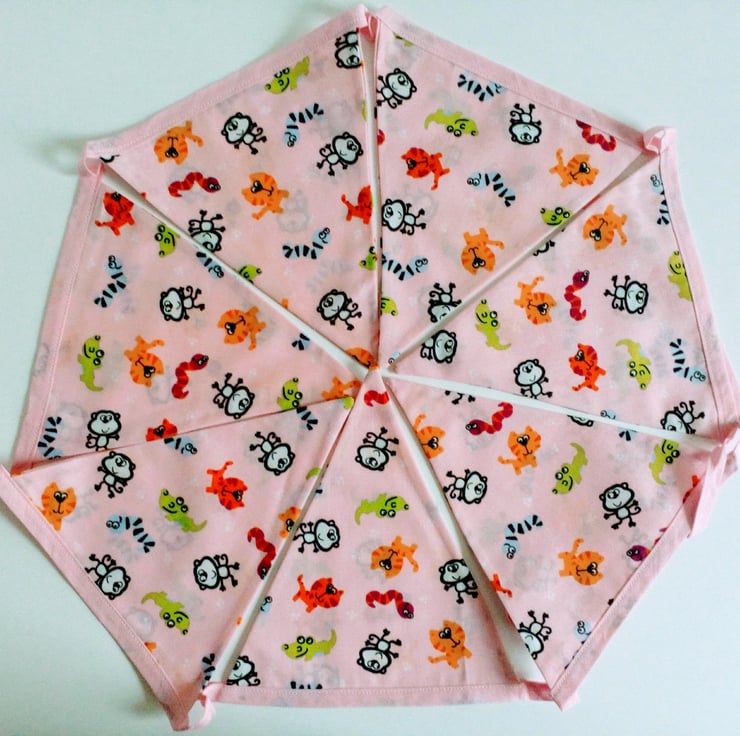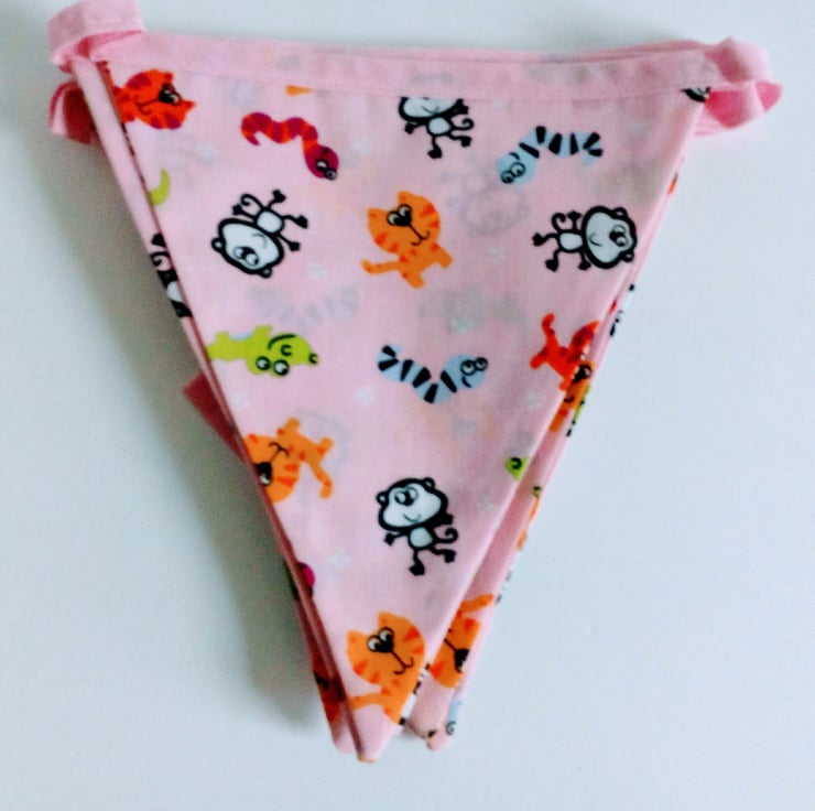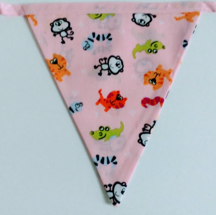 Each flag measures approx 20cm high by 18cm at the widest place (top). There are 7 flags measuring a total of 2 metres 30 cm. The flags have a pink background with a variety of nursery cartoon critters, monkeys, crocs, snakes, tigers in various colours (see pics). It is finished off with a pink binding tape.