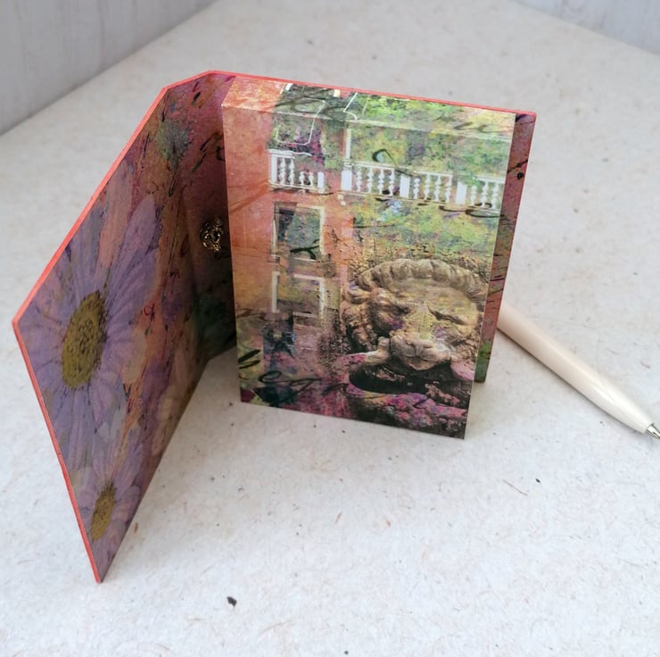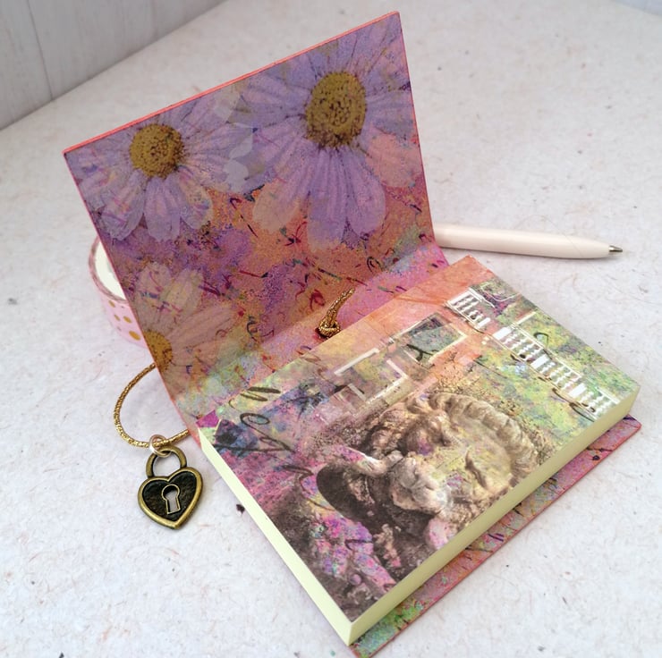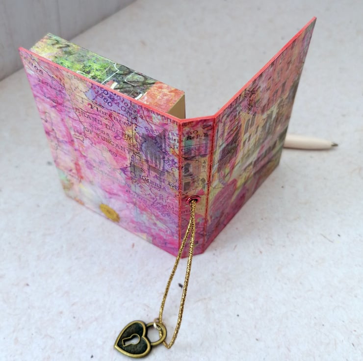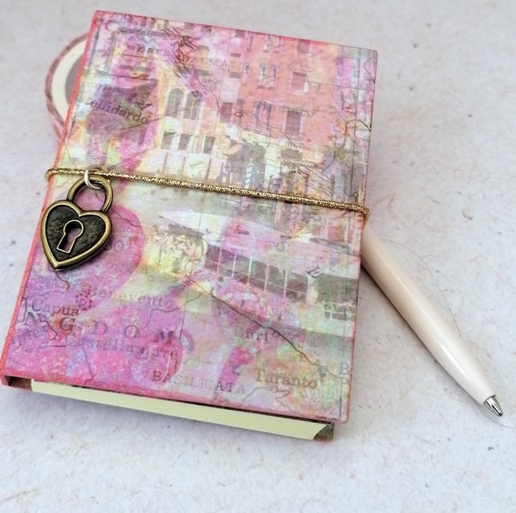 The cover is made from upcycled packaging covered in a decorative paper featuring a Venetian canal image. It is held closed with an elastic fastening embellished with a small heart charm.