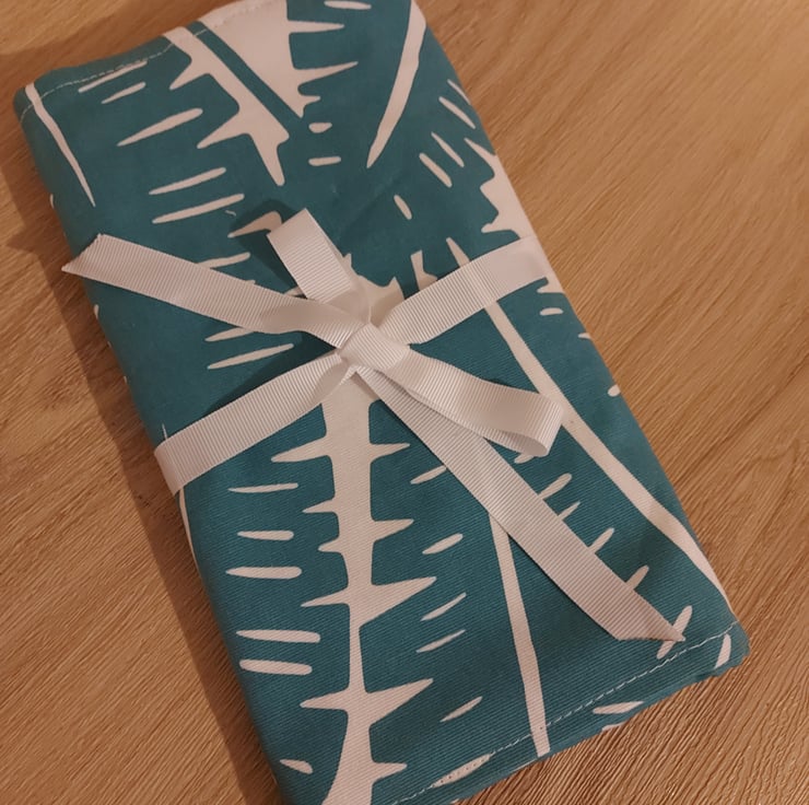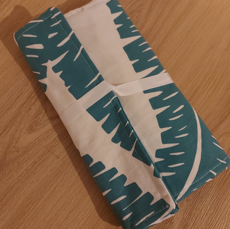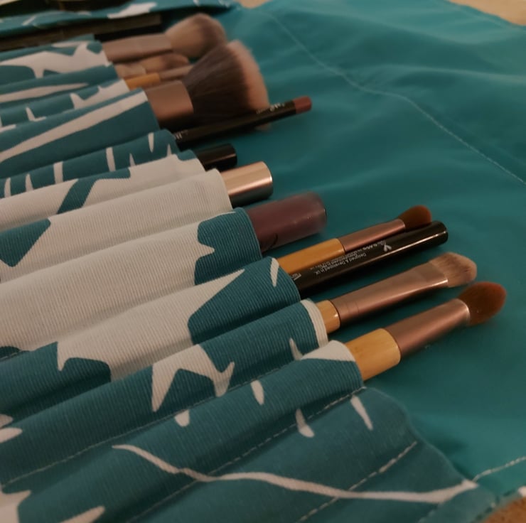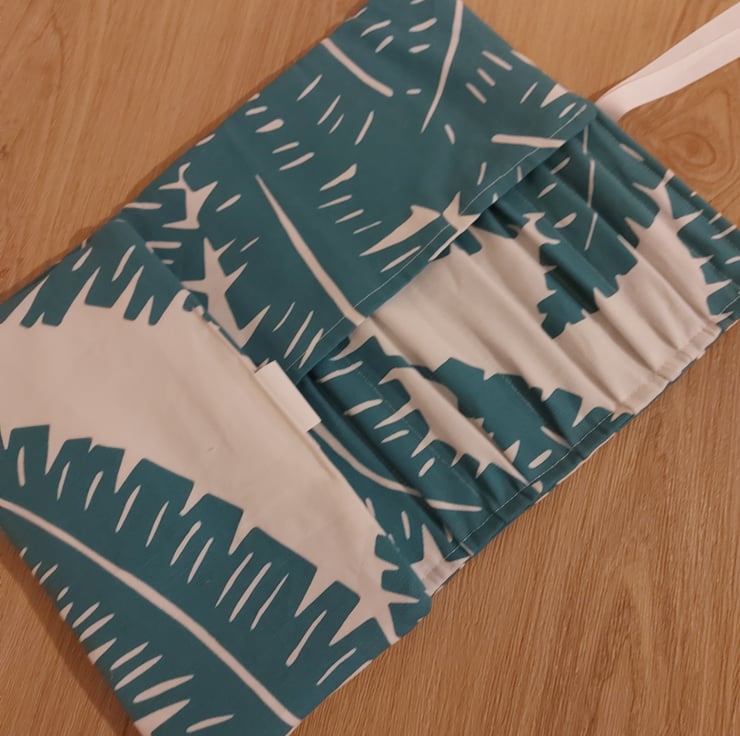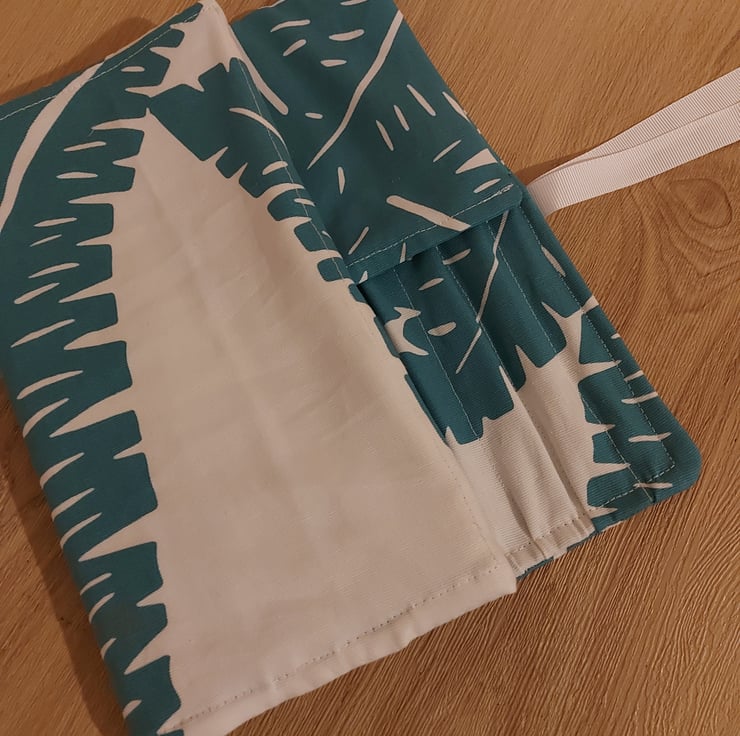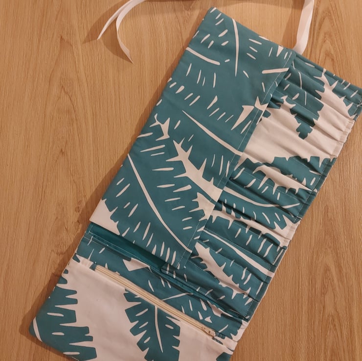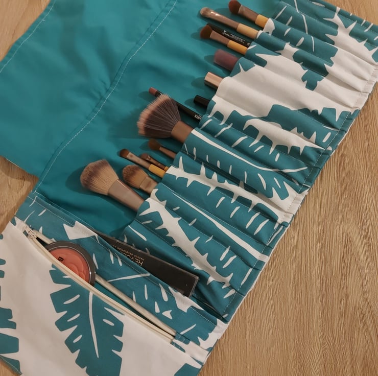 This is a teal banana leaf print make up bag and brush role . When you untie the ribbons it unroles there is a flap you lift up to stop your brushes from getting tangled and then lots of diffrent sized pockets for brushes and you maskara and eyeliners there is a large zipped pocket to use as a make up bag for the smaller items and a pocket undreneath that to use for a pallet