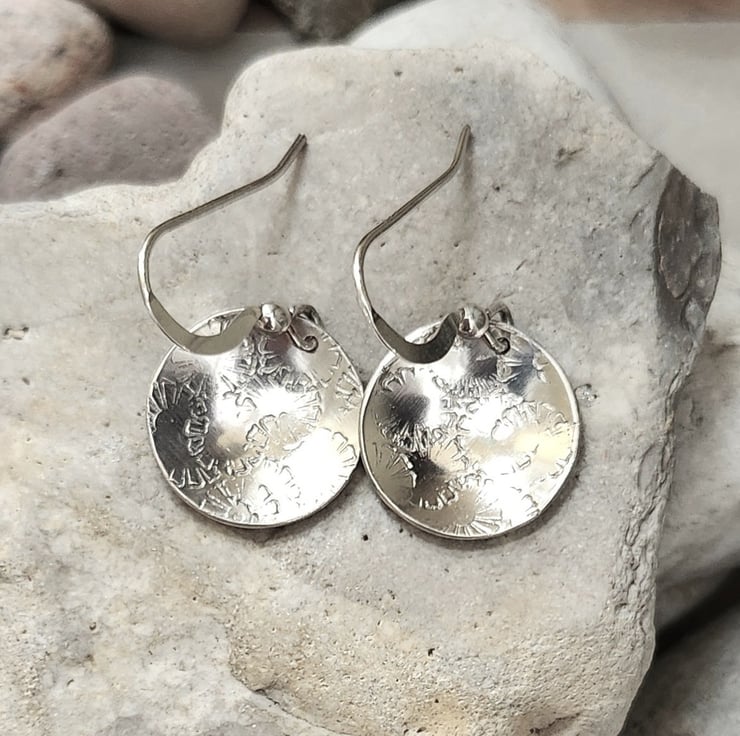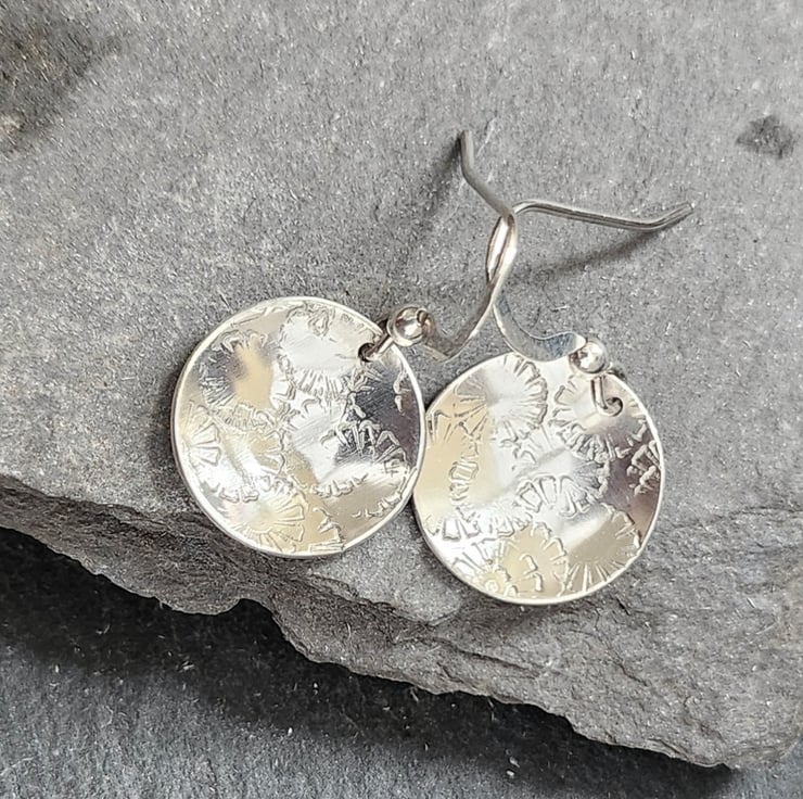 Sterling silver circles, imprinted with a random flower imprint and concave domed very slightly. 15mm across. The ear wires are also sterling silver.