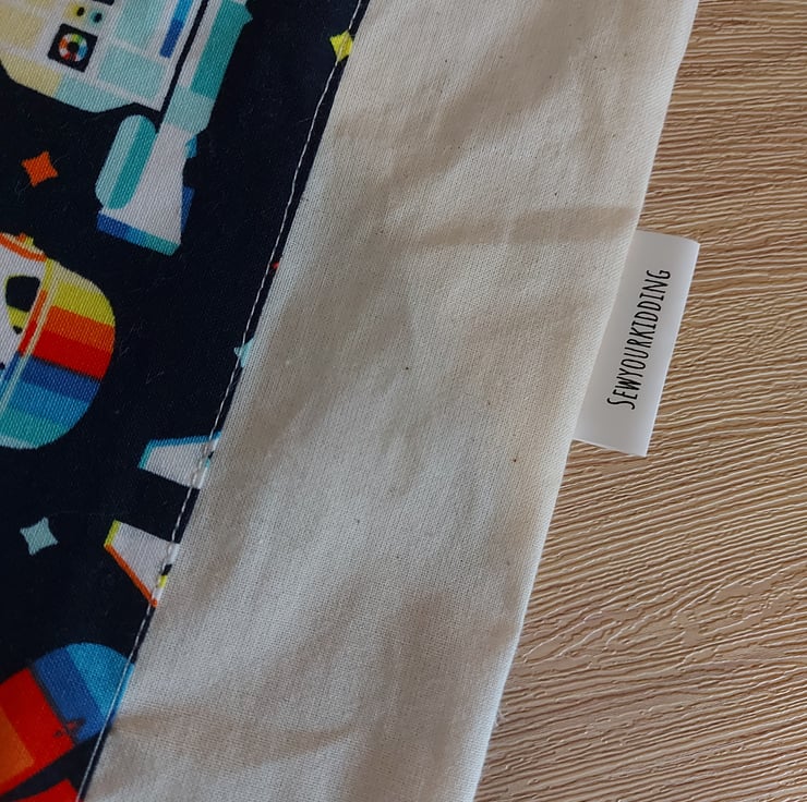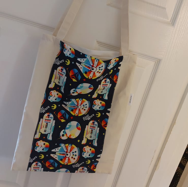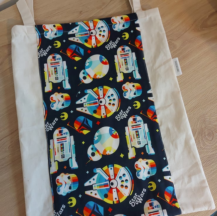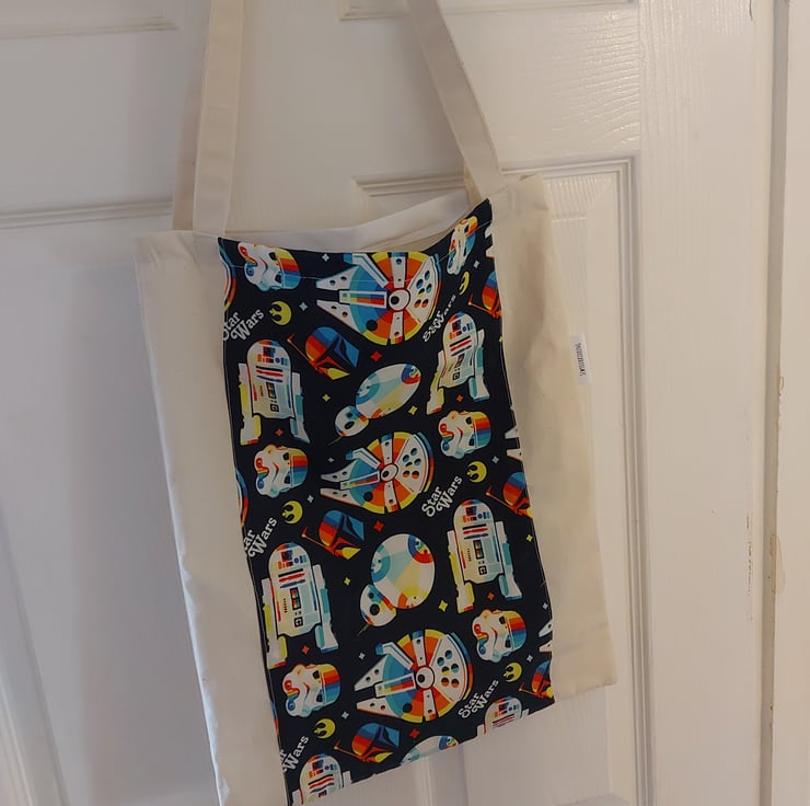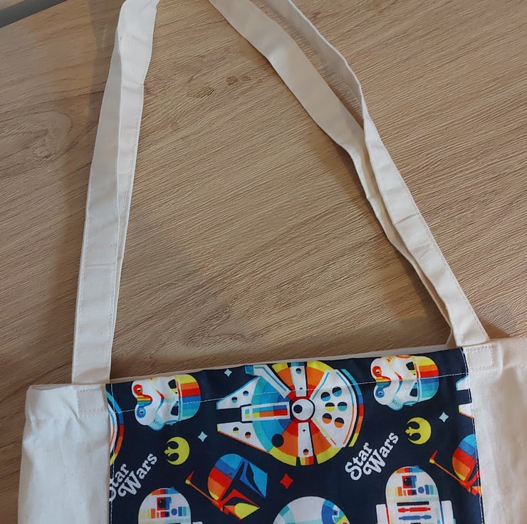 This is a one of a starwars tote bag the print feachers the melinumn falcon , R2D2 , BB8 and storm trouper helmits in black and white with a rainbo print over the top