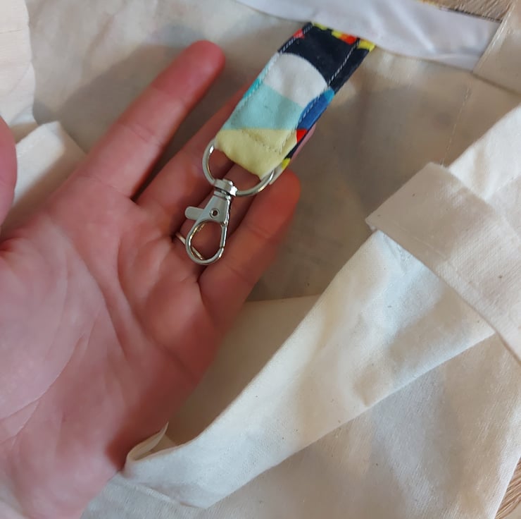 This bag meshes roughly 45 by 35 cm . The bag features a key clip so no more fumbling around the bottom of your bag hunting for keys . The front is backed in calico and the sides are sewn with french seams for strength