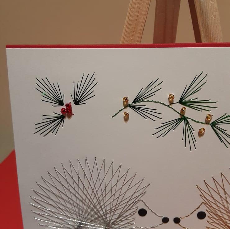 This cute Christmas card is hand embroidered with silver, gold and green metallic thread on white card mounted on a red card with an ivory insert left blank for your own message.