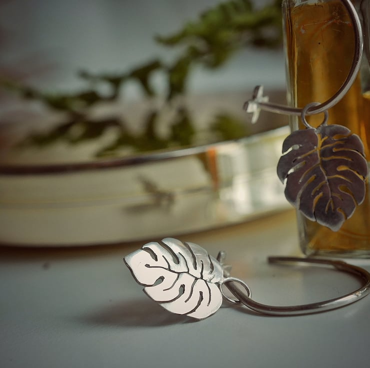 Hand drawn monstera leaves pierced from eco silver sheet dangle from chunky 1.3 mm hoops. A handmade cross stops the leaf from falling off.