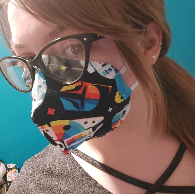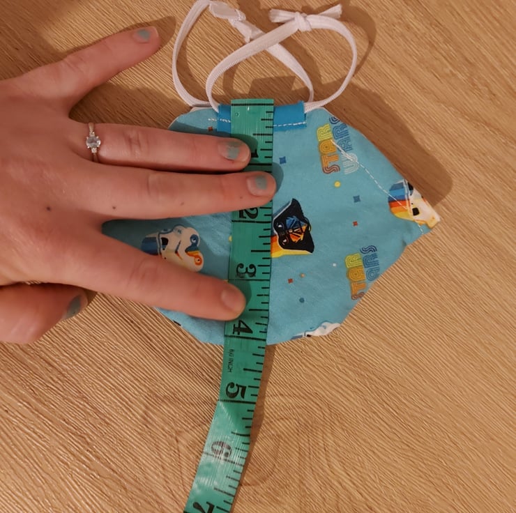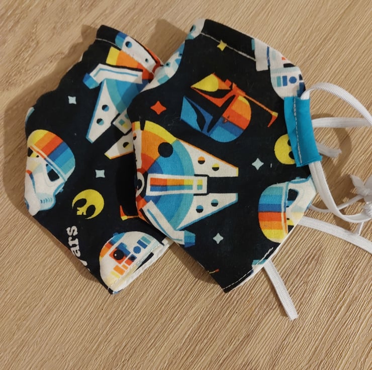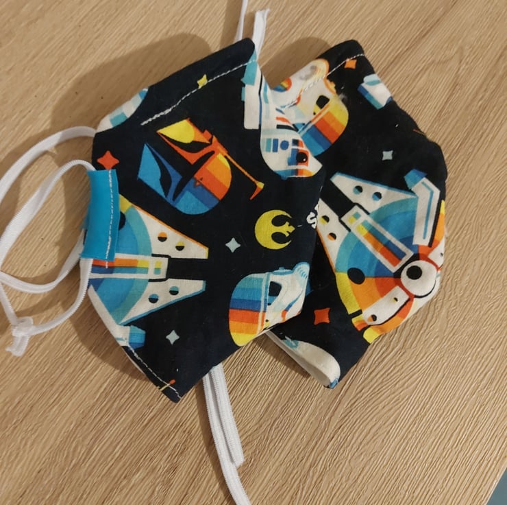 This is a handmade fabrick face covering which is designed to cover the nose and mouth. This is a diffrent design to the one i have used the most its ment to be more universall in fit and comes away from the mouth more so for those of us who have to talk at work all day it feels a little nicer for long term ware these are in a lovely black and white with the mellinum falcon , storm trouper helmits , BB8 and R2D