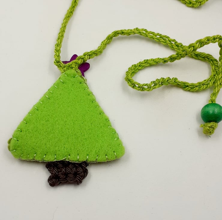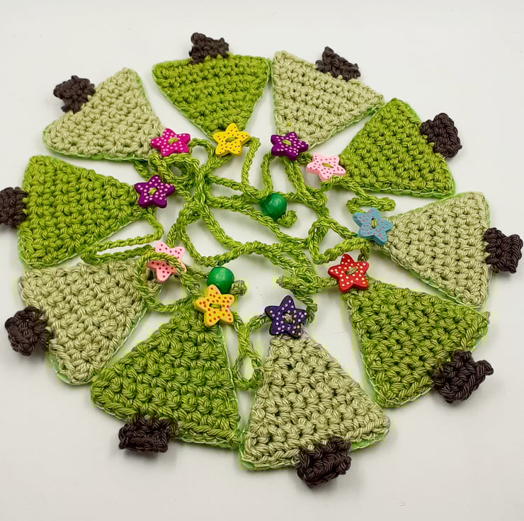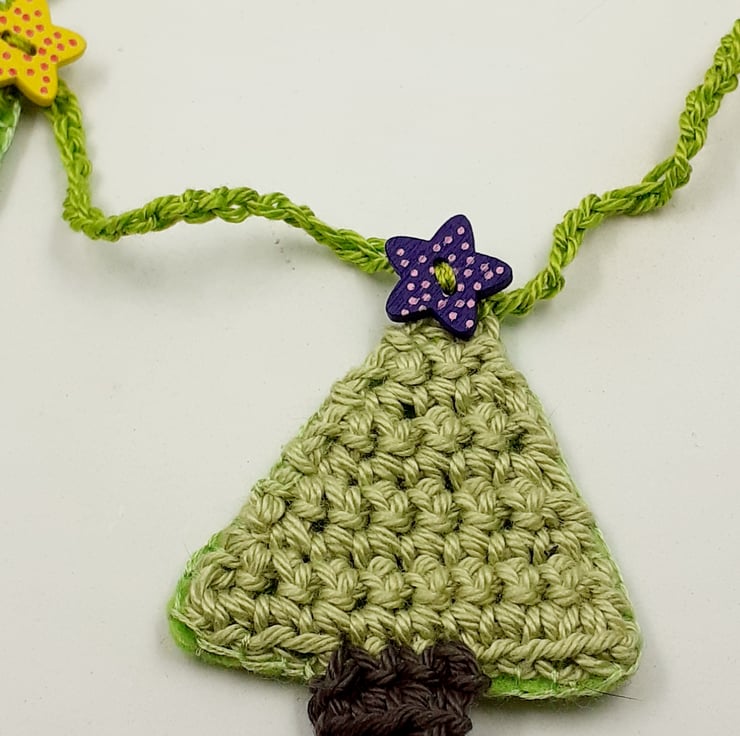 This pretty garland is crocheted in cotton and each little tree is topped with a painted wooden star button. The trees are backed in stiffened felt and the ends of the 'string' are finished with painted wooden beads for easy tying. The whole garland measures approximately 140 cm and comes wrapped in tissue in a labelled PIP (Postage in Proportion) box all ready to be given or posted on.