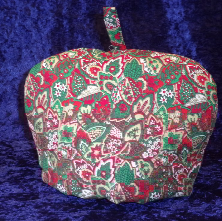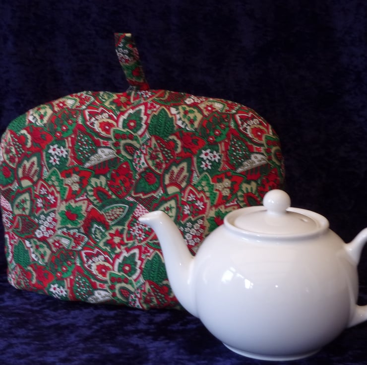 This Christmas Themed Tea cosy has a Paisley Style design of leaves in red and green and cream. It is made from 100% Cotton with polyester wadding which is stitched to the lining to prevent it from bunching up when it is washed. It even has a handy hanging loop so you could even use it as part of your decorations in the kitchen.