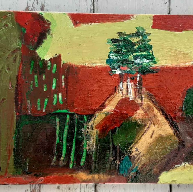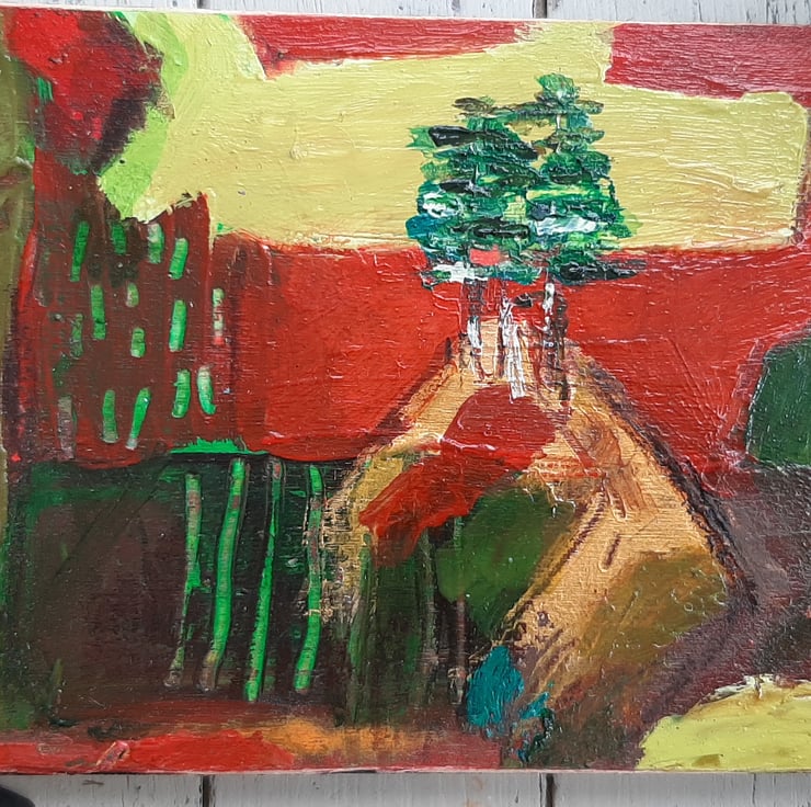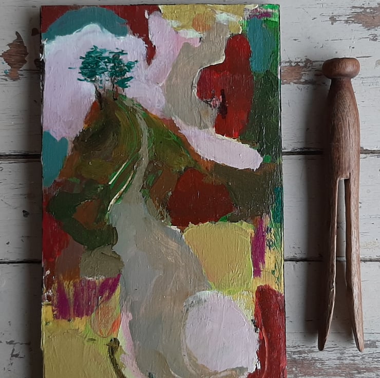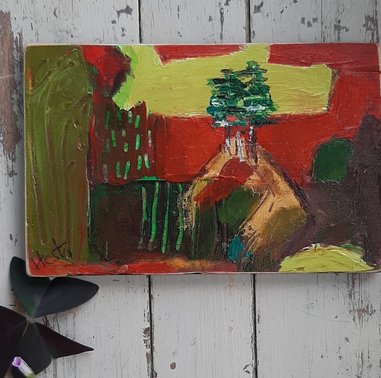Small but deep in colour and texture meauring just 17 cm long .using a limited palette and simple confident mark making .for a interesting yet naive painting with charm and depth. Unframed on reclaimed wood giving a more contemporary feel .a beautiful small autumn study of the landscape by artist hestasinglewood