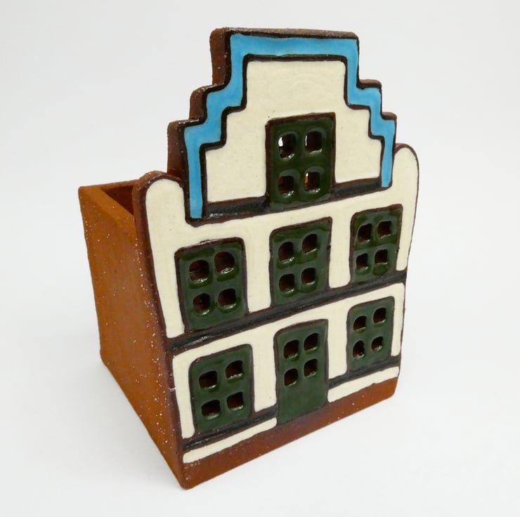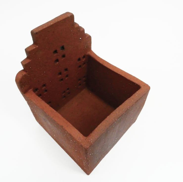 I make them by slab building using an Etruscan red clay. I use coloured slips to add the details on the front the rest is left unglazed as it has the colour and texture of red brick. I have designed this to be a tea light holder as the windows are all cut out to allow the light though, but it could also be use for a small plant or pen pot.