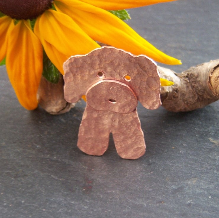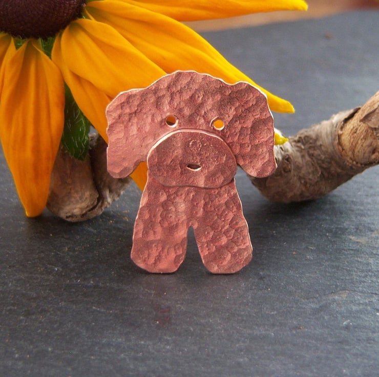 Puppy dog cut from copper sheet and textured. Just over 3cms tall. Finished with a sterling silver brooch fastener.