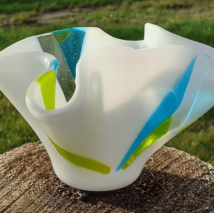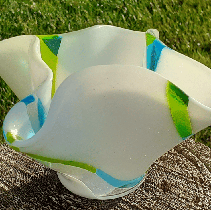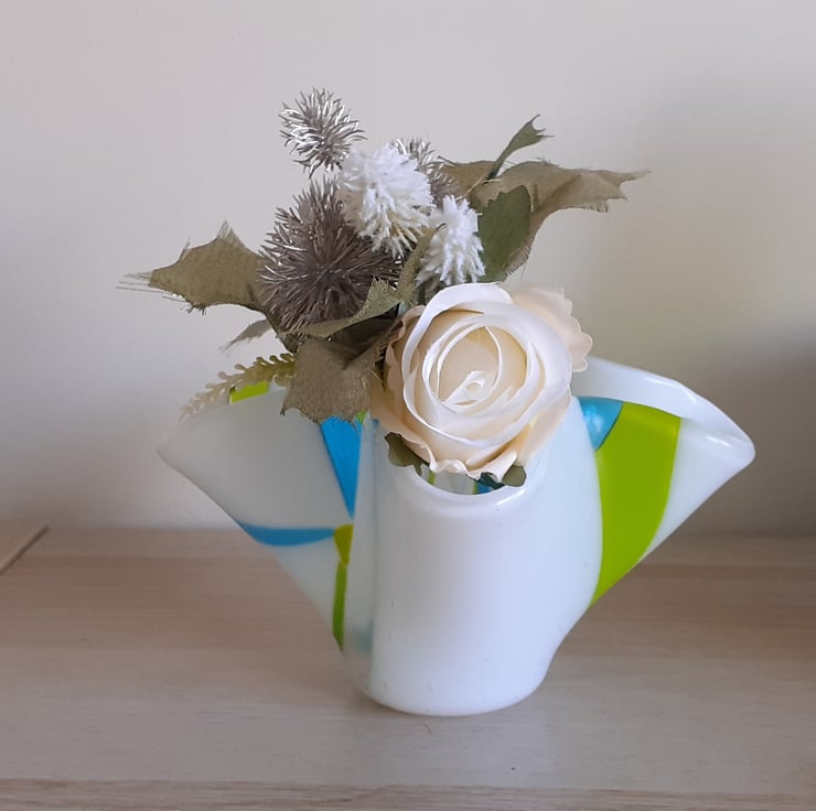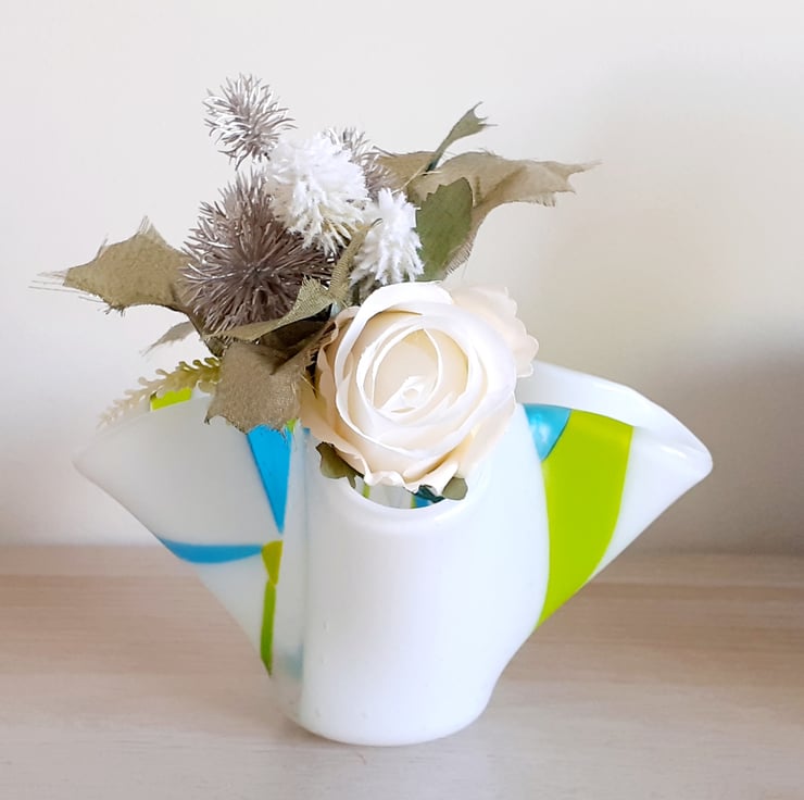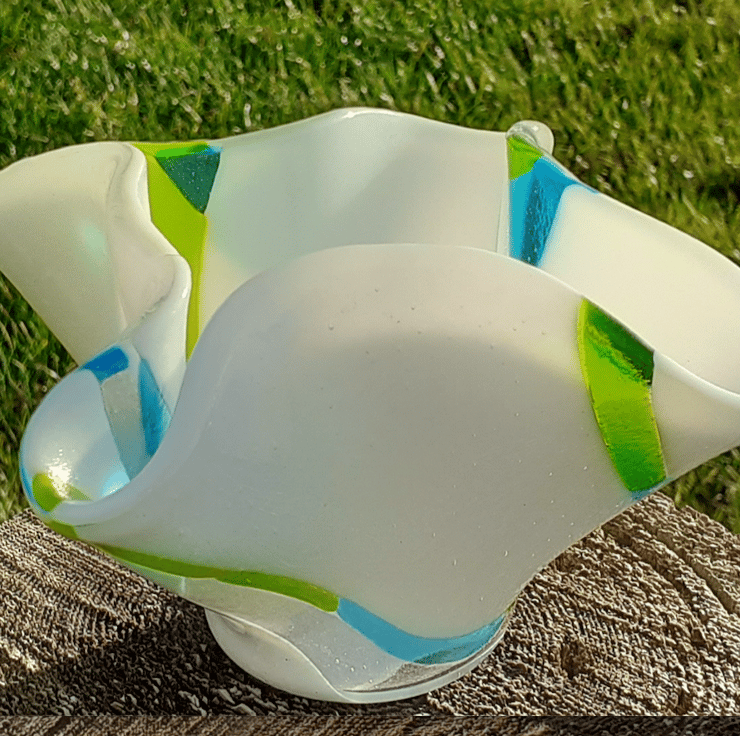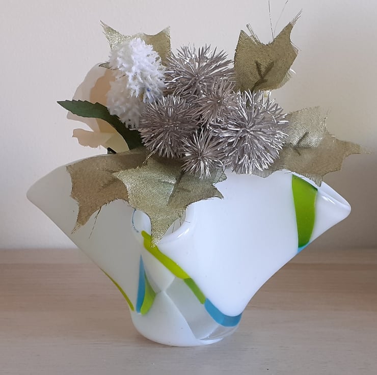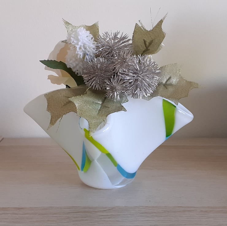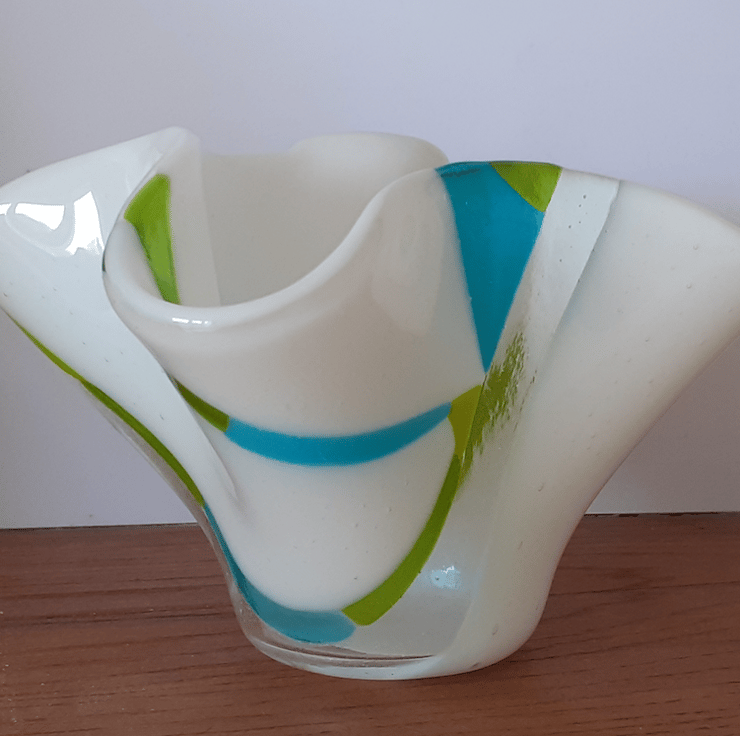 This fused glass organically shaped vessel measures approximately 10cm high and 17cm x 7.5cm across at its widest and narrowest points. Transparent ribbons of green, turquoise and clear glass are shot randomly through a white base, giving bright pops of colour. The piece has been kiln-fused together to a smooth finish and then 'draped' over a mould and fired again at a lower temperature which results in the lovely free-form organic edges. The vase looks different depending on which side it is viewed from.