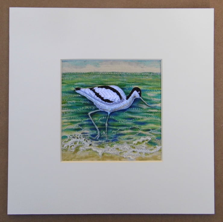 A machine embroidery of the distinctive Black and White wading bird - The Avocet. On a hand coloured silk background with added lace and stitched detail. Mounted with acid free off-white mount card.