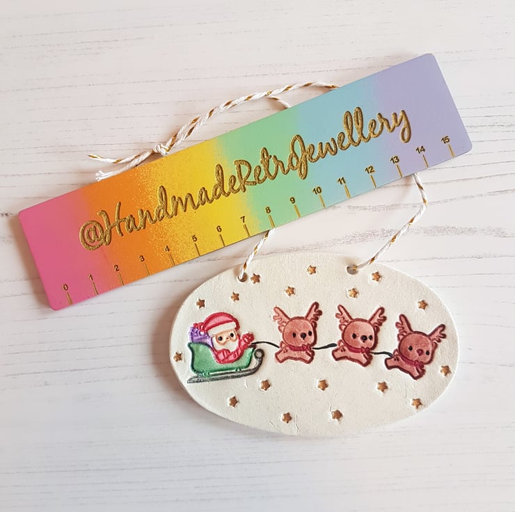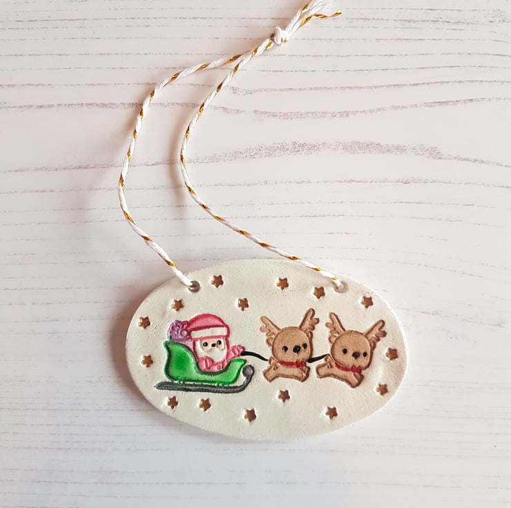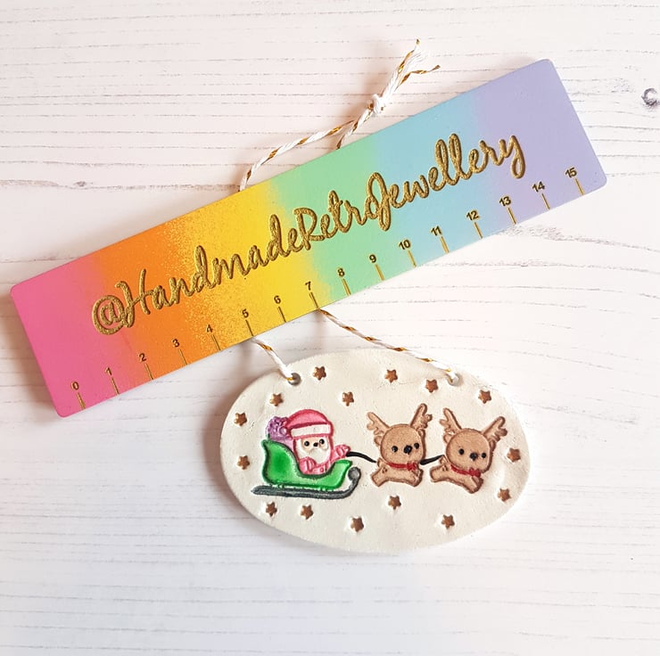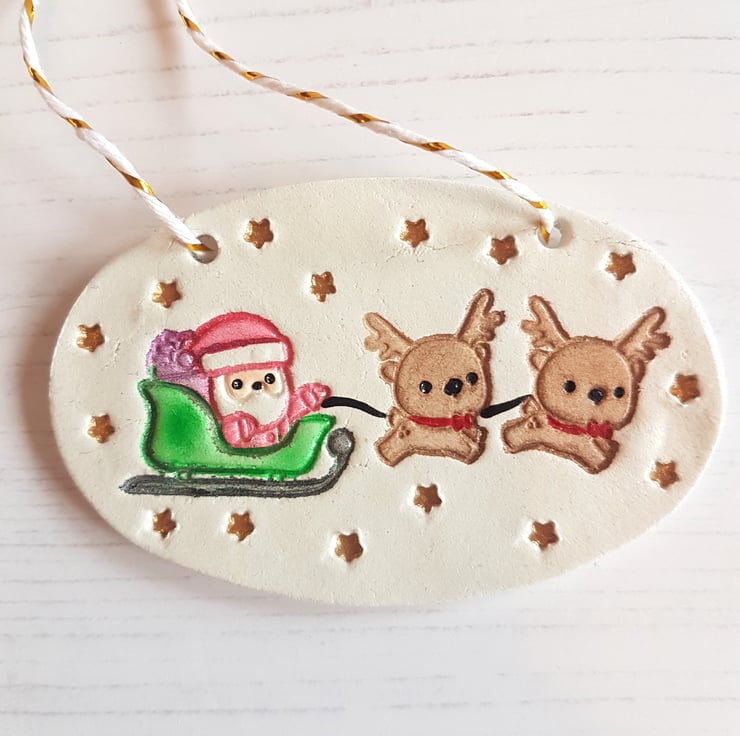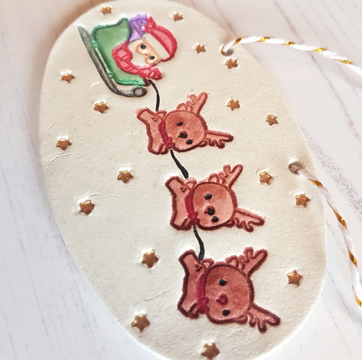This cute Christmas themed plaque has Santa riding in his sleigh, being pulled along by reindeer! Surrounded by gold stars as he whizzes through the sky!