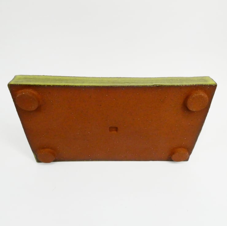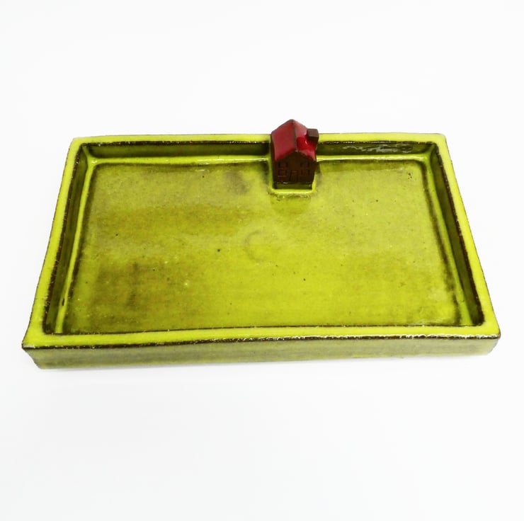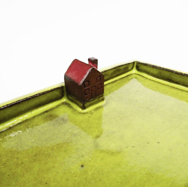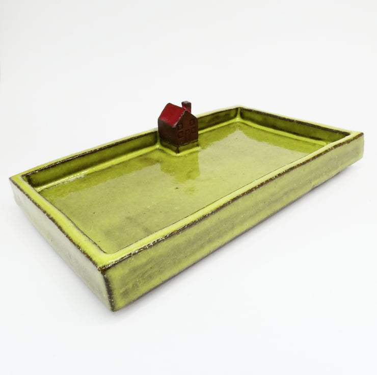 The is a small ceramic tray with a little house made to look like it is sat in a green lawn. It is slab built from a dark bodied clay and glazed in a green and red glaze. I have left the house without a finish as the brick red clay is a perfect contrast. The tray sits on 4 round feet.