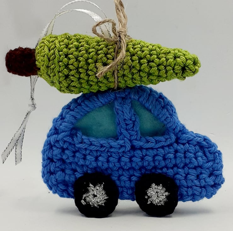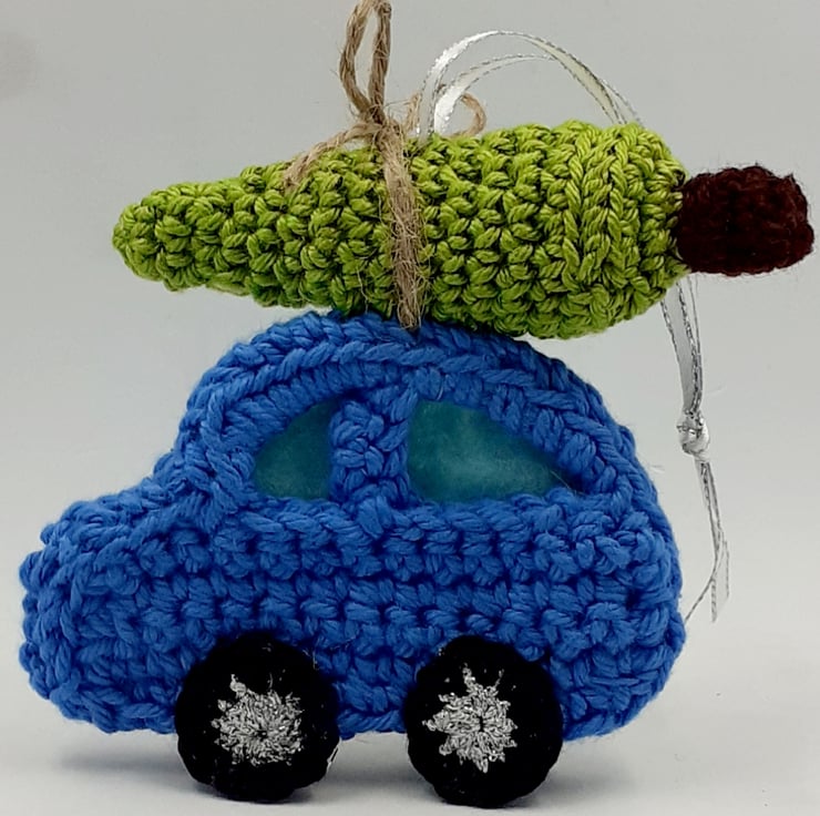 This sweet little car carrying a Christmas tree would make a great alternative to a Christmas card this year and a pretty tree decoration for many years to come. It is crocheted in cotton and metallic thread and the windows of the car are lined with felt. The tree is filled with polyester stuffing and 'tied' to the roof of the car with jute string. It comes with a tag attached bearing the words, 'Driving Home for Christmas ' or if you prefer, a tag with your own personal message. The car comes wrapped in tissue in a labelled PIP (Postage in Proportion) box all ready to be given or posted on.
