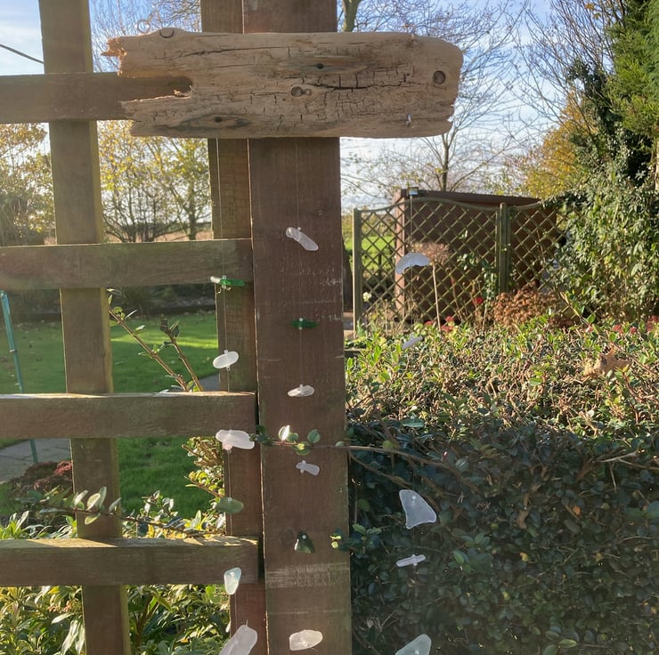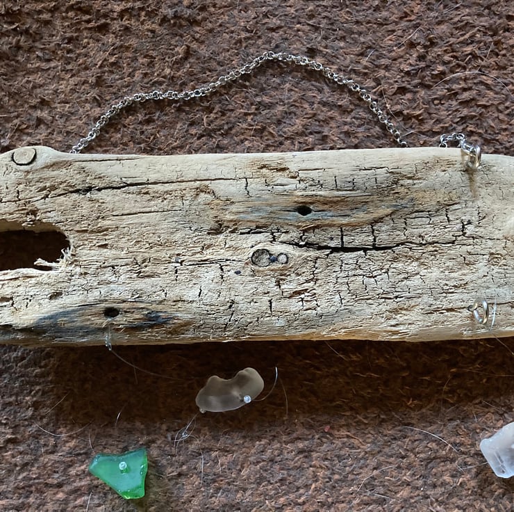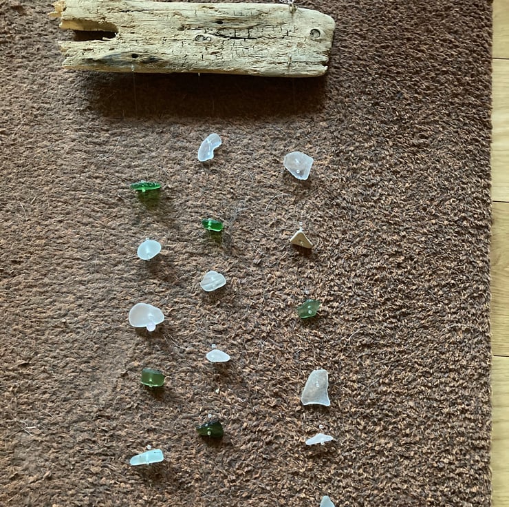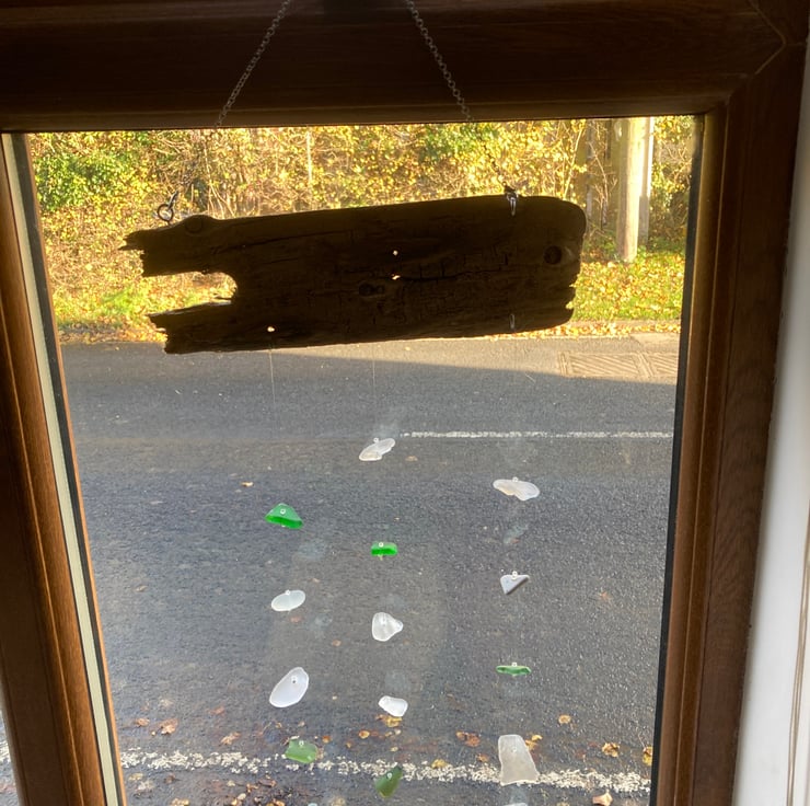 Seaglass and driftwood collected from Withernsea beach has been used to make this 3 stranded suncatcher, suitable for inside use as a window decoration or outside in the garden. A chain is used to hang the suncatcher using small metal screw in eyelets to join the chain and two of the strands to the wood.