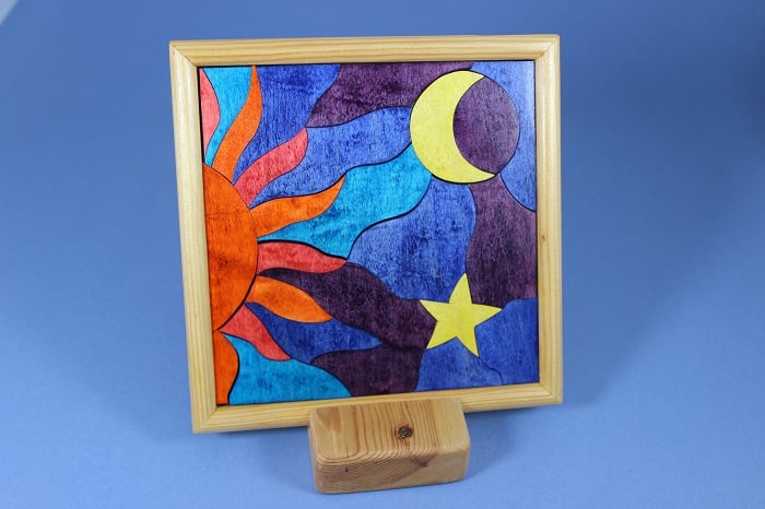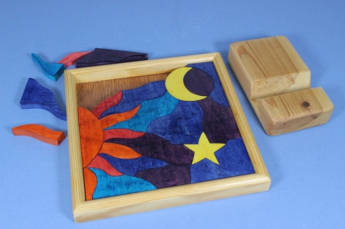 Colourful desk top puzzles in an attrative Sun Moon & Star design an ideal gift for anybody who spends time at there desk. The puzzle can either be laid flat or mounted in the frame as desk top ornament. The frame edging is made from pine with plywwood backing.The puzzle itself is made from 10mm thick maple, stained in bright colours, and coated in a hardwearing lacquer providing a satin finish.
