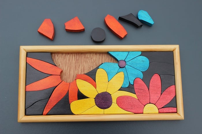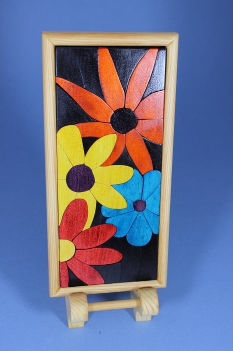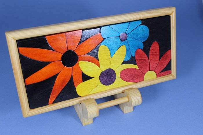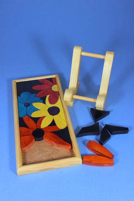 Colourful puzzle in an attrative floral design an ideal gift for anybody who spends time at there desk. The puzzle can either be laid flat or mounted in the frame as a desk top ornament. The frame edging is made from pine with plywood backing.The puzzle itself is made from 10mm thick maple, stained in bright colours, and coated in a hardwearing lacquer providing a satin finish.
