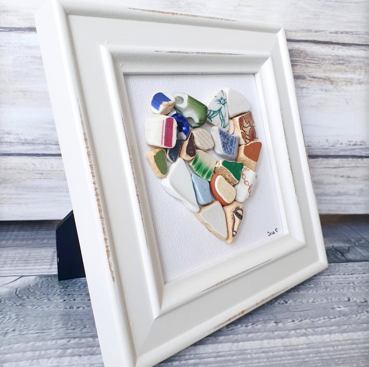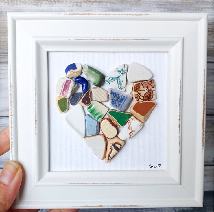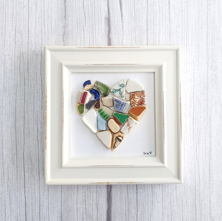 This heart is created with many pieces of seapottery found personally on the coasts of UK and London Thames foreshore. The heart is on canvas and the shabby chic frame measures approximately 14.5cm x 14.5cm. The frame will come without glass. Loose items are for photo purposes only. Please note that all photos have been digitally watermarked. The actual art piece will not bear the mark.