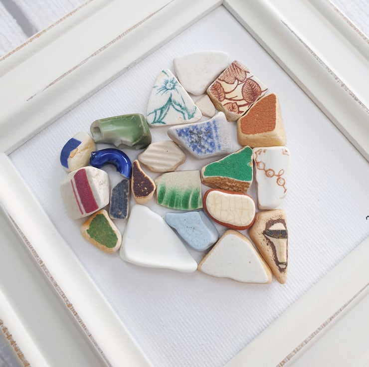 Each artwork is "one of a kind" as materials used are natural and kept exactly the way I found them, true to how the sea tumbled them. Hours were spent walking miles along the coastlines and foreshores to find these beautiful treasures. It takes a lot of practice to spot a seapottery especially when they're camouflaged among sand, shingle and pebbles. To create the artwork, I often use days to find the right size and look of individual seapottery to create a piece that I'm happy to share with others.