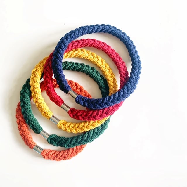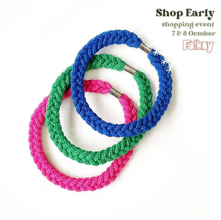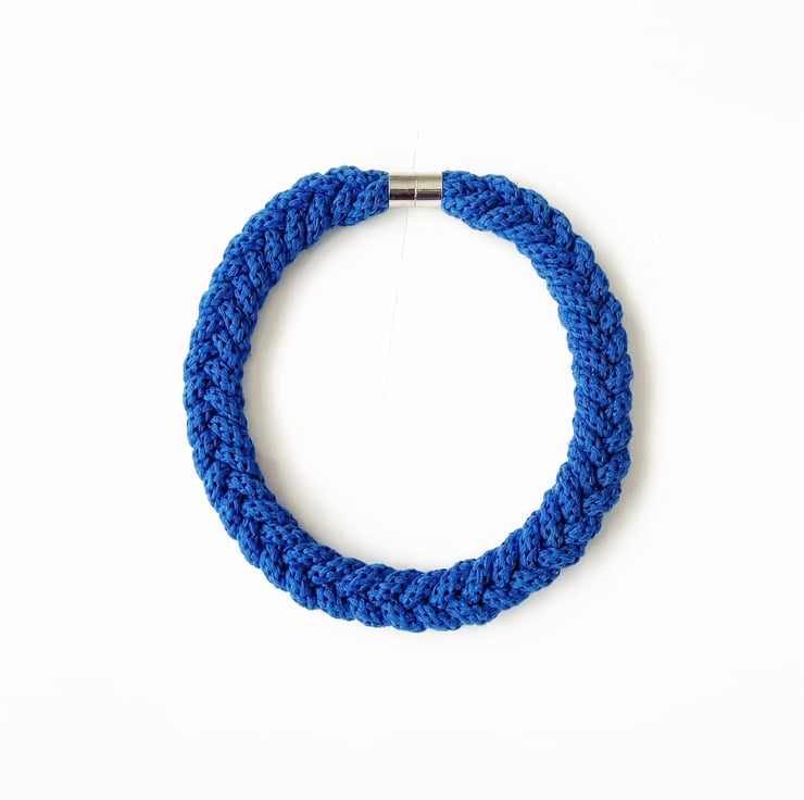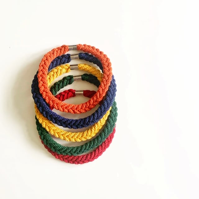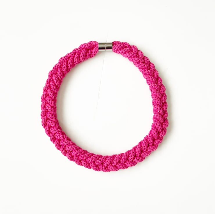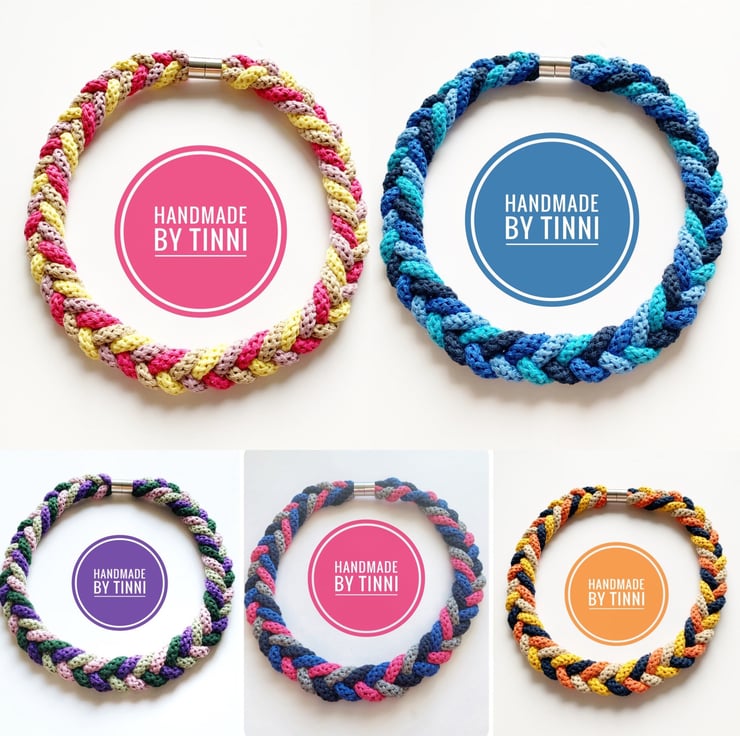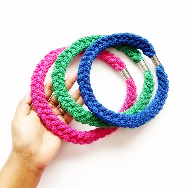 A beautiful handmade necklace. It is made using soft cotton rope. It’s around 45 cm in length. Can be made longer. It has magnetic lockable clasps to give a beautiful finish. This necklace is also hand washable.