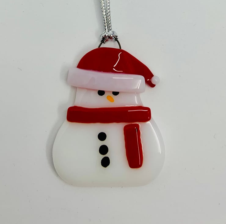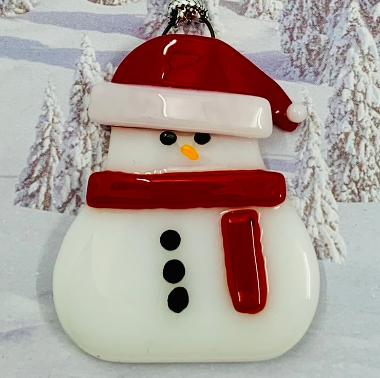 Handmade Fused Glass Snowman Hanging Christmas Decoration.