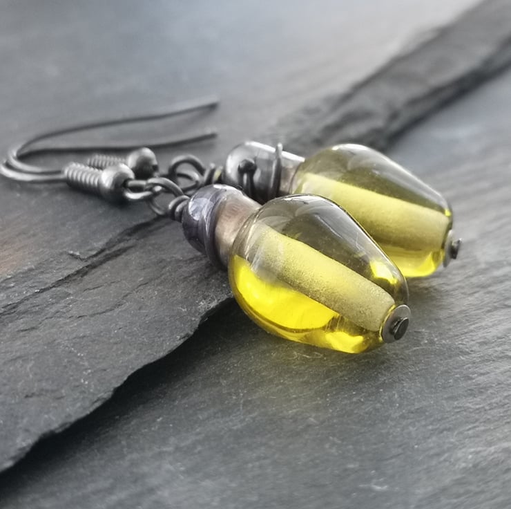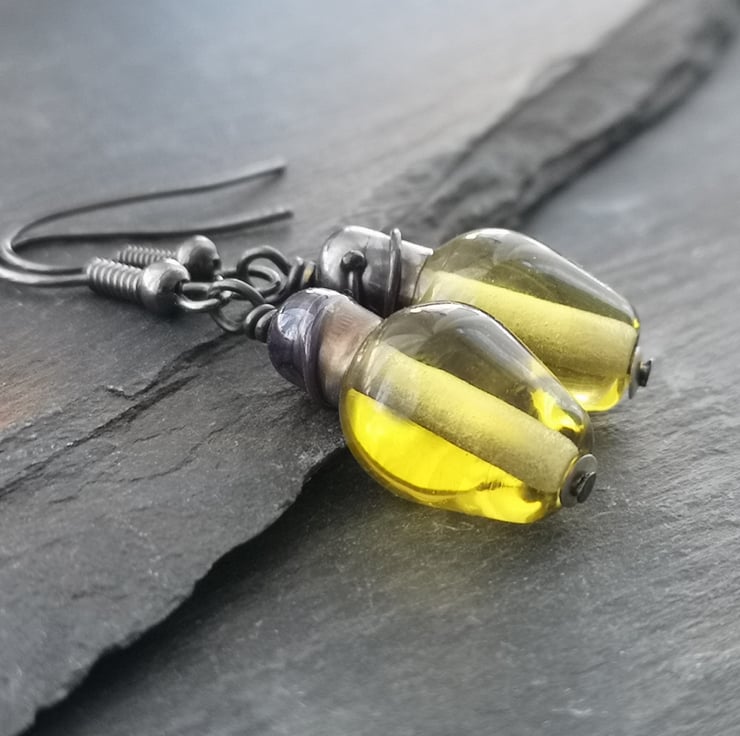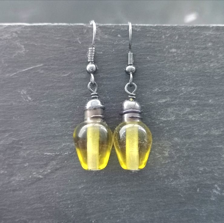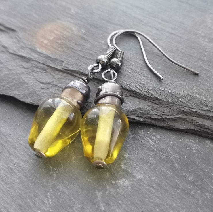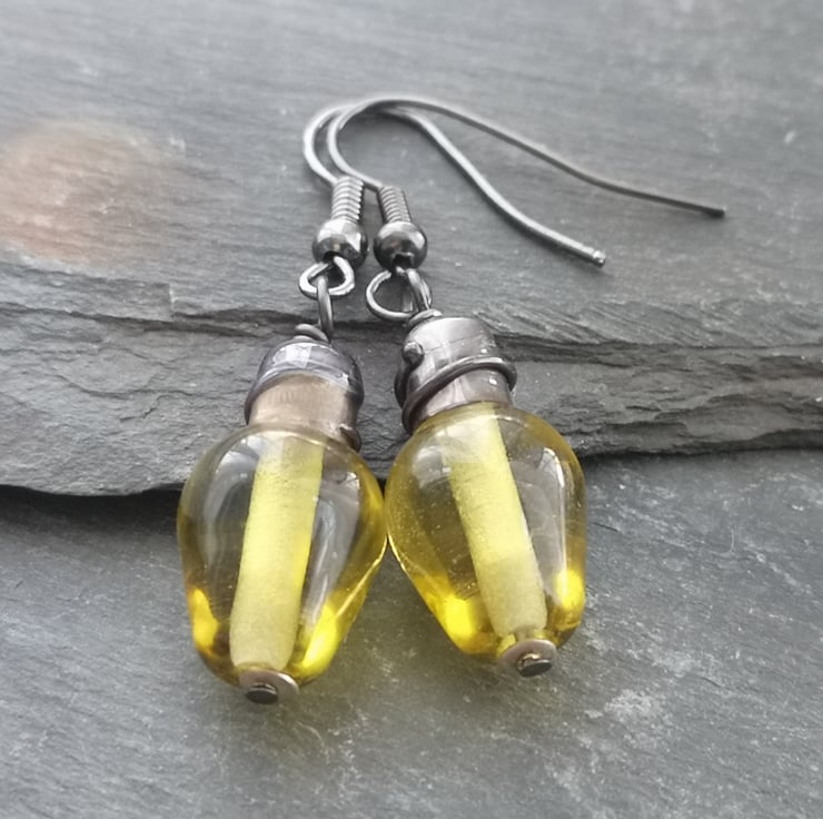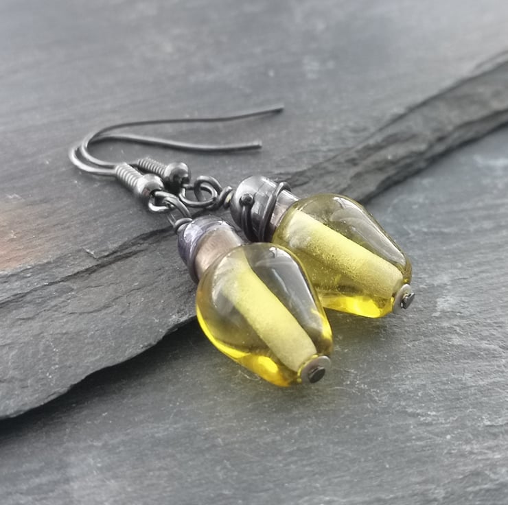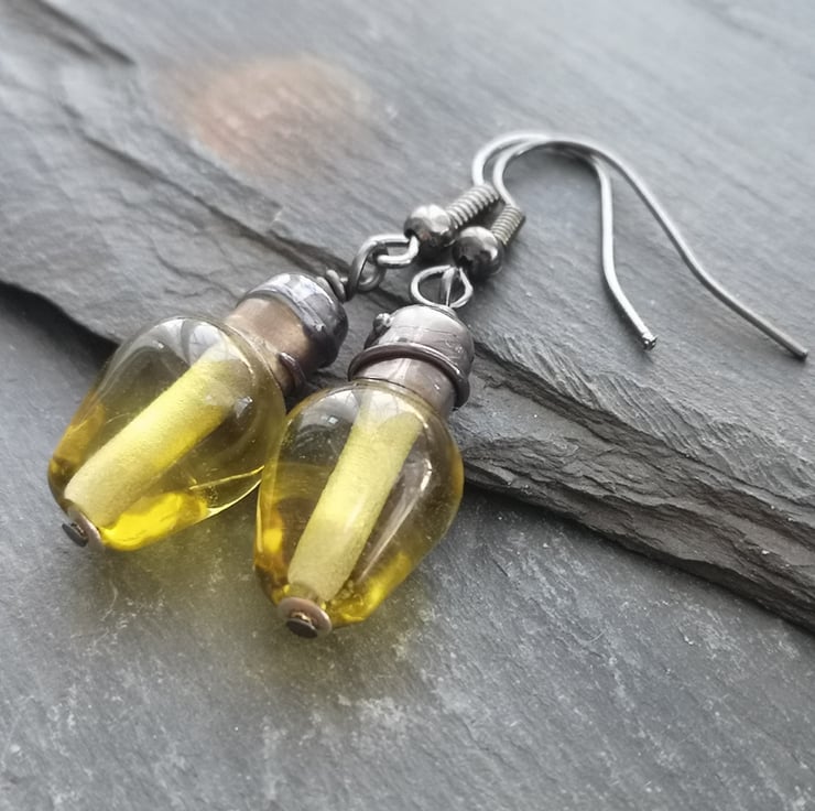 These festive earrings feature handmade lamp work glass fairy light beads in a lovely golden yellow. They've been attached to gunmetal ear wires.