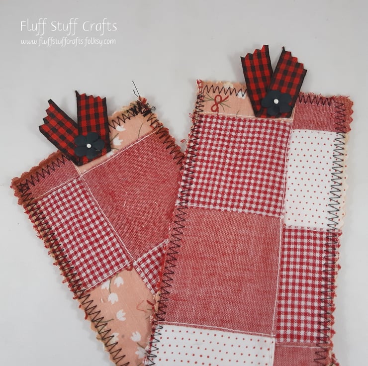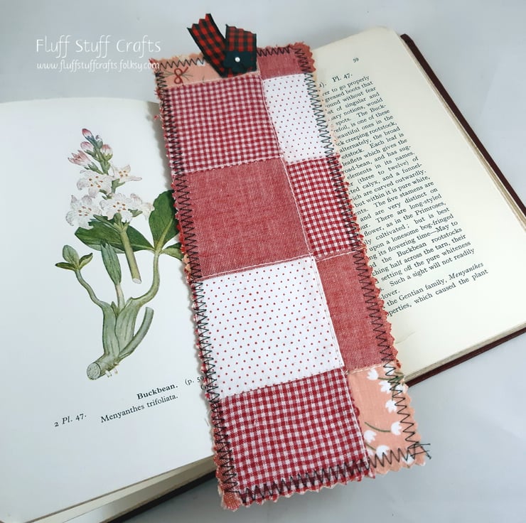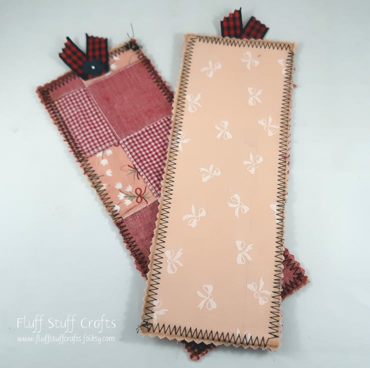 A bit of shabby chic meets grunge in these two fabric bookmarks. They started out life as a piece of junk mail and some scrap fabric and ribbon. Each has red patchwork fabric on one side and peach cotton with white bows on, on the reverse. The edges have been cut with pinking shears, stitched roughly with a zigzag stitch in black thread and inked with distress ink. They are finished with red and black tartan ribbon with a black paper flower.